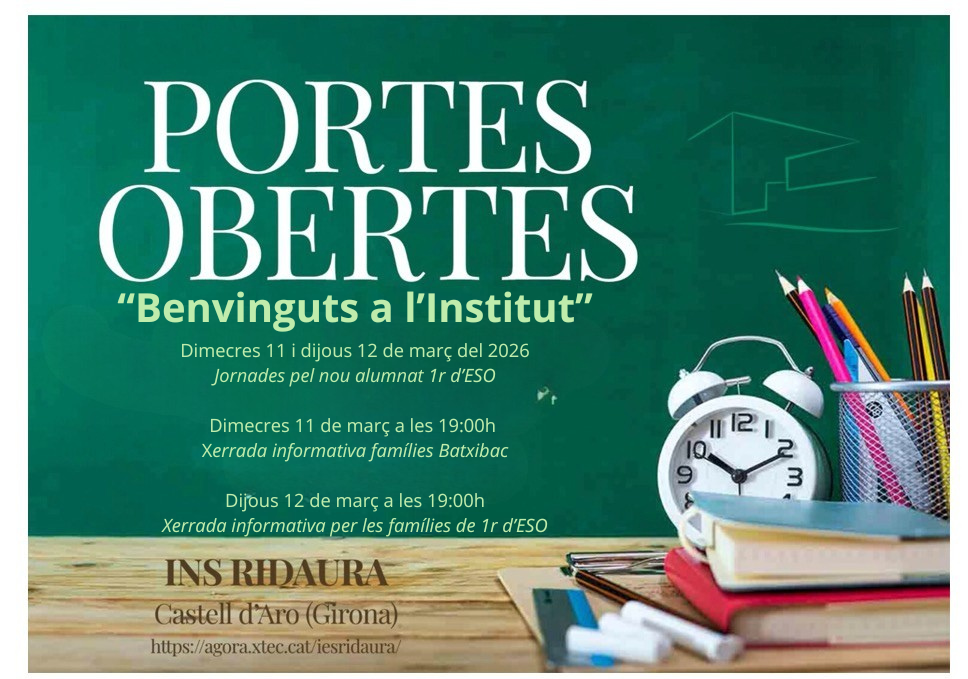 El dimecres 11 i el dijous 12 de març 2026 tindrà lloc la Jornada “Benvinguts a l’Institut” que s’emmarca dins les Jornades de Portes Obertes de