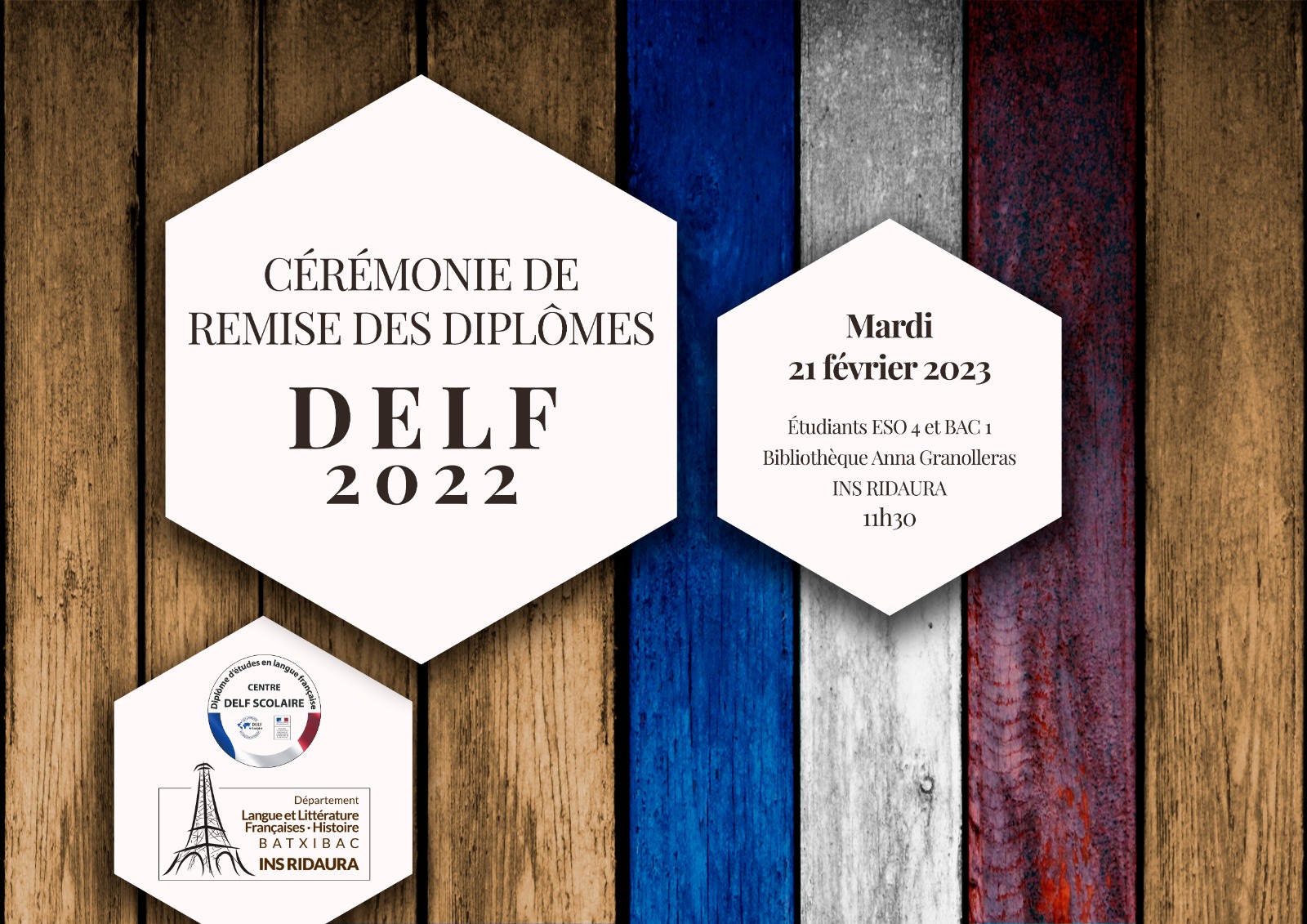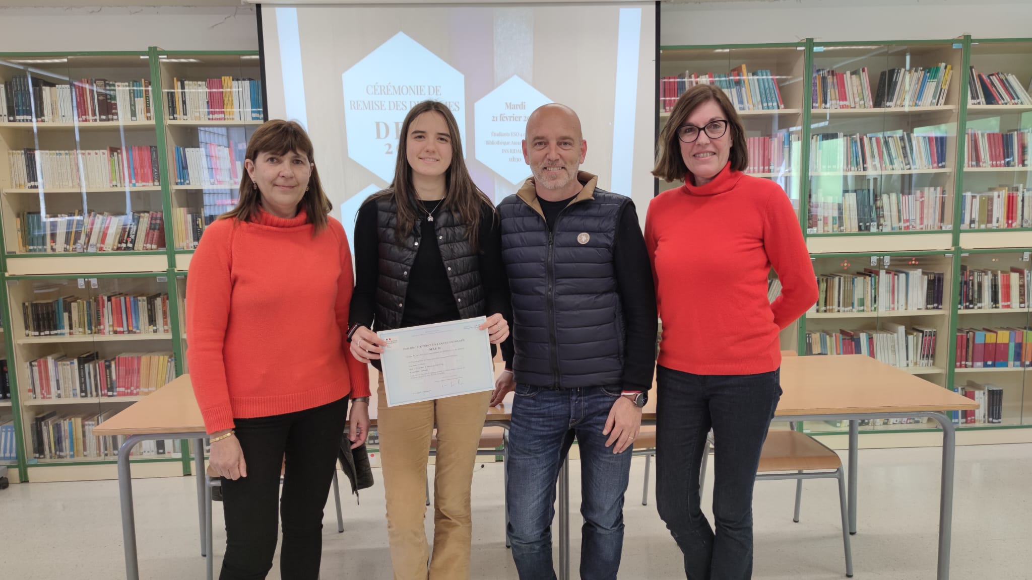 El lliurament dels diplomes ha anat a càrrec de la Directora de l’INS Ridaura, Núria Albertí, la Coordinadora Pedagògica, Carme Sousa, el Coordinador DELF i Cap de Departament de Llengua i Literatura franceses, Carles Ramírez, i la professora de llengües estrangeres, Aloma Grifoll.
