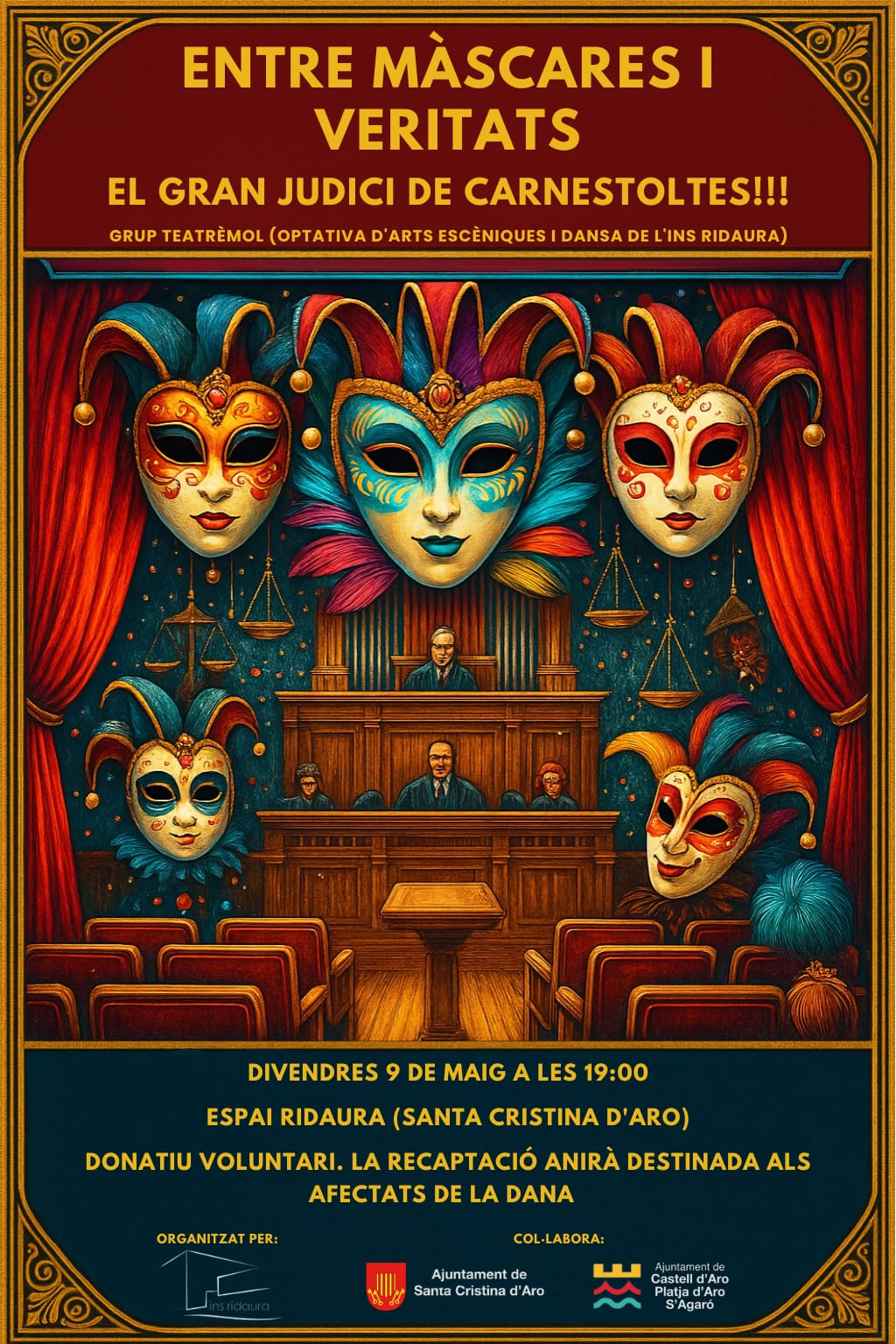 La companyia teatral Teatrèmol, de l’optativa d’Arts Escèniques i dansa de l’INS Ridaura, té el plaer de convidar-vos a l’espectacle ENTRE MÀSCARES I VERITATS: EL GRAN JUDICI DE CARNESTOLTES!!!, que es durà a terme el divendres, 9 de maig, a les 19 de la tarda a l’Espai Ridaura de Santa Cristina d’Aro. Es tracta d’una funció oberta a tot el públic pensada per a recaptar diners per als afectats de la DANA mitjançant una donació voluntària dels assistents.
