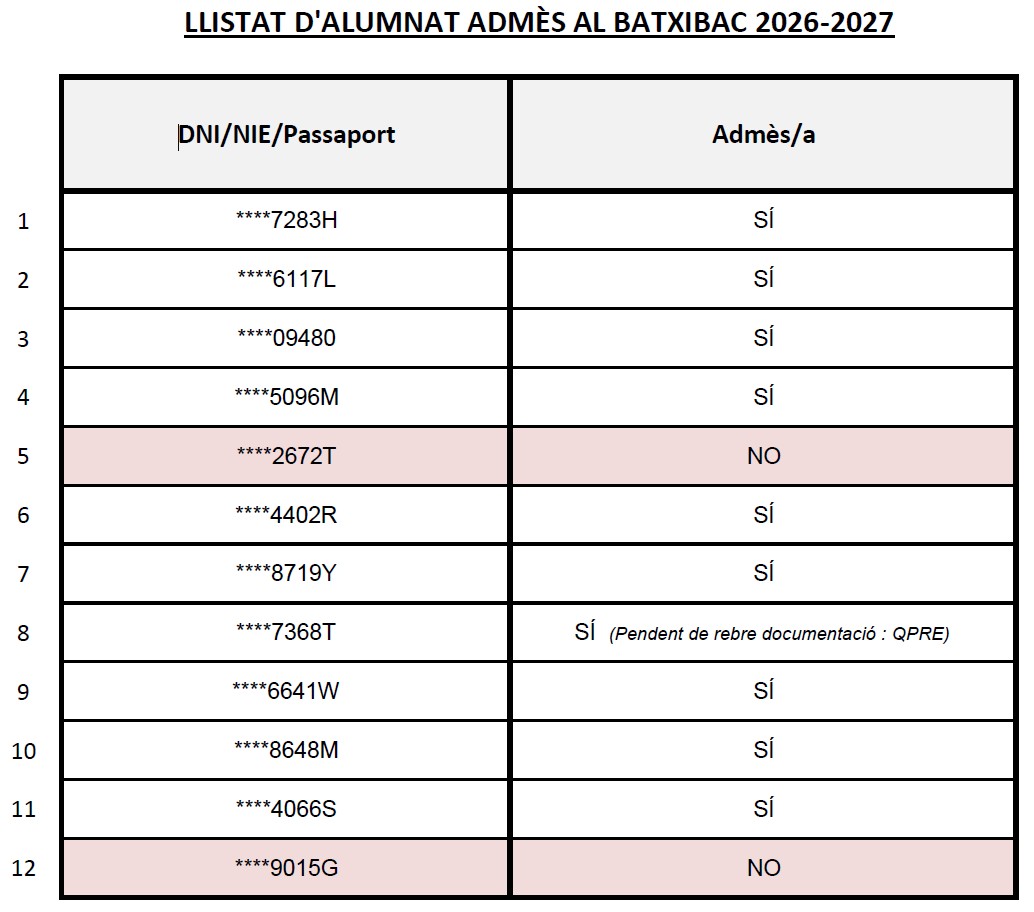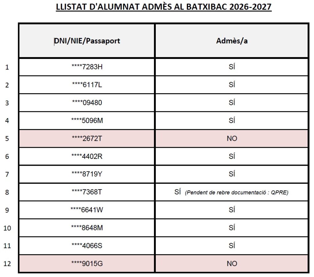 A continuació i seguint els criteris d’assignació establerts a la normativa vigent que aprova les normes de preinscripció i matrícula per al curs 2026-2027, es publica el llistat d’alumnes Admesos / Pendents de prova de nivell o Documentació acreditativa / No admesos,  per a cursar l’ensenyament de BatxiBac (Batxillerat + Baccalauréat) a l’Institut Ridaura,