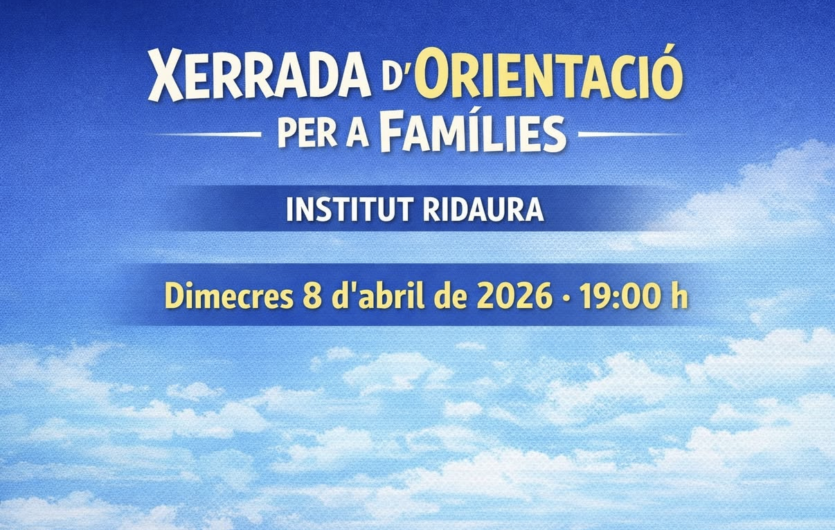 Us convidem a la xerrada d’orientació a Batxillerat o a Cicles Formatius de Grau Mig per a famílies, que tindrà lloc el dimecres, 8 d’abril, a les 19:00h, a l’Institut Ridaura.