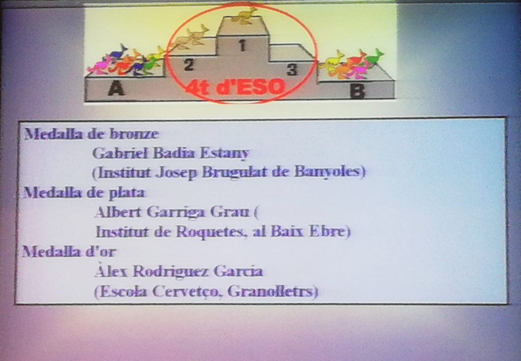 L’alumnat de l’institut Roquetes sempre ha obtingut bons resultats en la Prova Cangur. Concretament el curs passat, Albert va aconseguir el 27è lloc de la classificació i dos alumnes més es van situar en el lloc 45è i 54è respectivament. Però aquesta ha estat la primera vegada que s’ha aconseguit un premi de la categoria pòdium.
