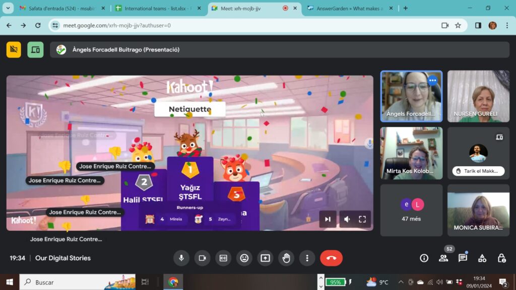 El dia 9 de gener, a les 19 hores, es va celebrar la nostra primera reunió online d’estudiants de 1r de Batxillerat dels quatre instituts que formem part del projecte etwinning “Our Digital Stories”: Institut Roquetes, Institut Dertosa de la veïna ciutat de Tortosa, Ekonomsko-birotehnička škola de Slavonski Brod, Croàcia i Şehit Turgut Solak Science High School de Balıkesir a Turquia.
