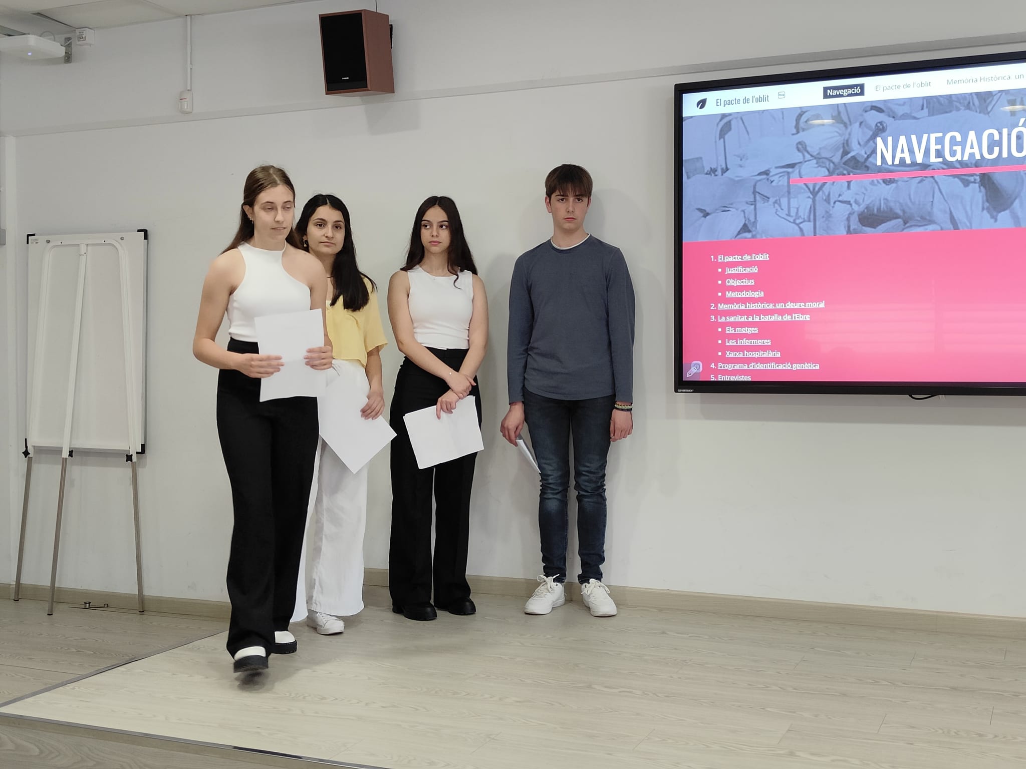 En acabar, alumnat de 1r de Batxillerat ha explicat el projecte “El Pacte de l’Oblit”, en el que han treballat des de la matèria de filosofia, a partir del visionat del documental La llibreta del doctor Gras, van centrar-se en la recerca de la vessant sanitària de la Batalla de l’Ebre, els hospitals de sang i els escassos recursos sanitaris, fent èmfasi en la feina de les infermeres.