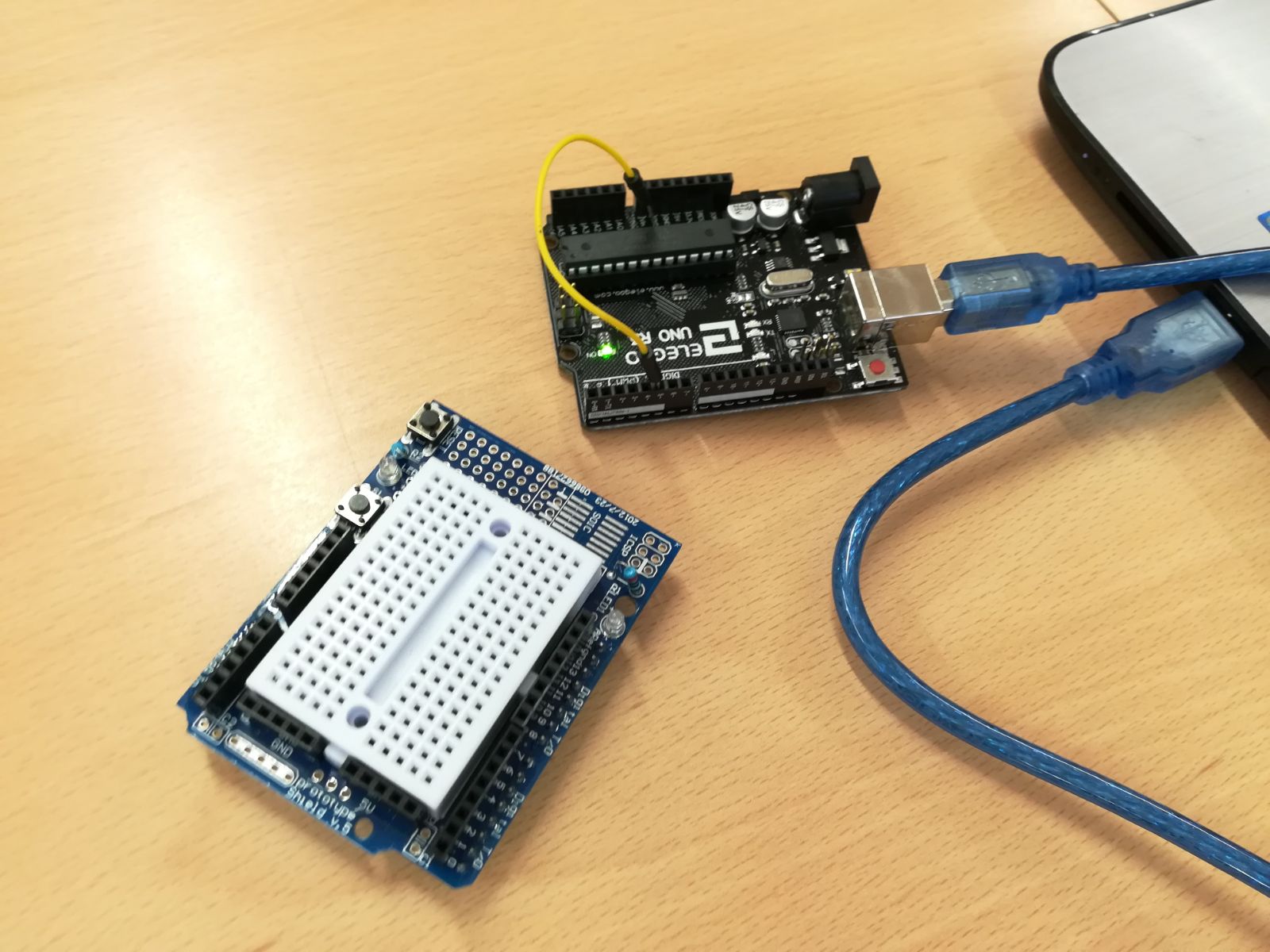 En aquest últim apartat, vam treballar utilitzant la placa (havent separat la shield) i un cable com una mena d’interruptor (pràctica 7), ja que desconnectàvem i connectàvem el cable de la placa deixant passar, o no, la corrent i engegant el LED quan hi havia corrent. Vam comprovar també, que no funcionava del tot a la perfecció, a vegades la placa engegava la llum sense cap motiu.