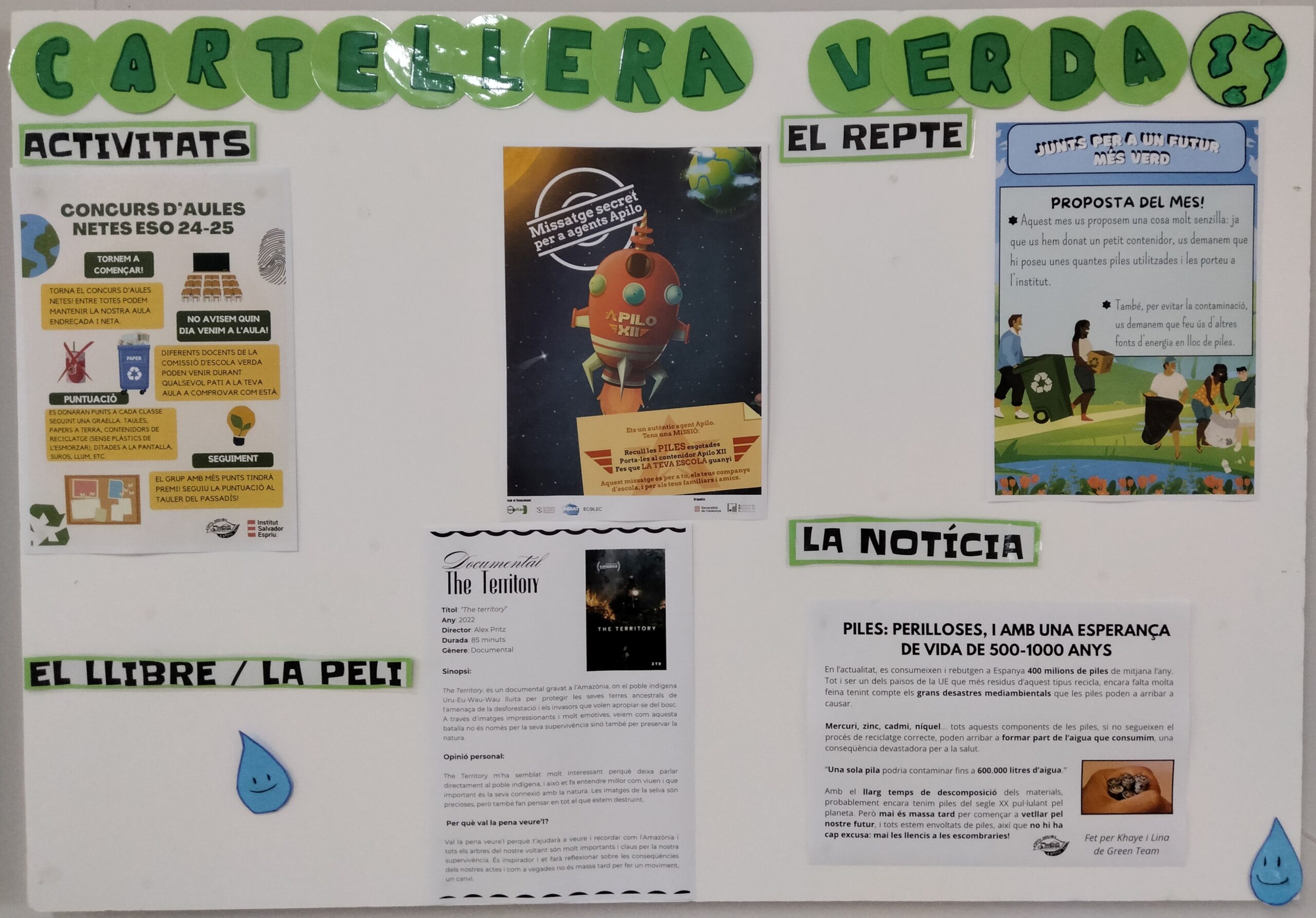 Així mateix, aquest curs hem creat una Cartellera Verda, un punt d’informació sobre reptes, suggeriments i notícies mediambientals amb la finalitat de promoure la cultura de centre, alhora que continuem amb el concurs d’aules netes.