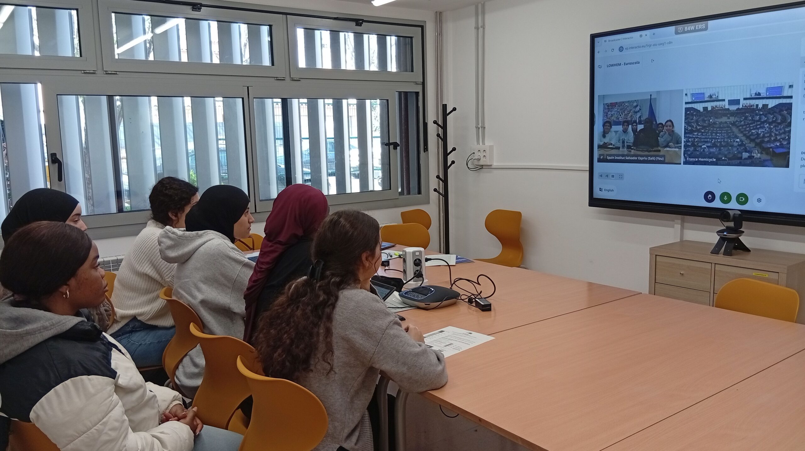 Durant la sessió, que va comptar amb diversos convidats i un programa que es pot consultar a la pàgina oficial d’Euroscola del Parlament Europeu, els estudiants dels centres participants podien intervenir amb preguntes als ponents. En aquest context, dues alumnes del nostre institut, la Chaima i la Fatu, van intervenir en directe, fet que va convertir l’Institut Salvador Espriu en el centre que més intervencions va fer entre tots els instituts presents a l’activitat.