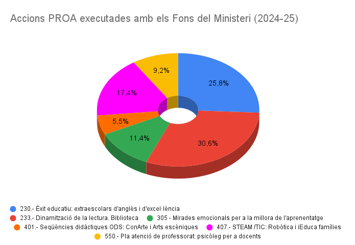 Des de fa uns anys tenim la sort de comptar amb unes ajudes que venen de Fons europeus, ja sigui a través del Ministeri d’Educació o d’assignació pròpia del Departament d’Educació. Es tracta de la coincidència del “Pla de millora d’oportunitats educatives” (PMOE) i el “Programa de cooperació territorial per a l’orientació, l’avenç i l’enriquiment educatiu” (PROA+ 2021-2024). Els beneficiaris d’aquests ajuts són l’alumnat dels 715 centres de major complexitat educativa pel fet de les seves condicions socioeconòmiques i socioculturals desfavorides.