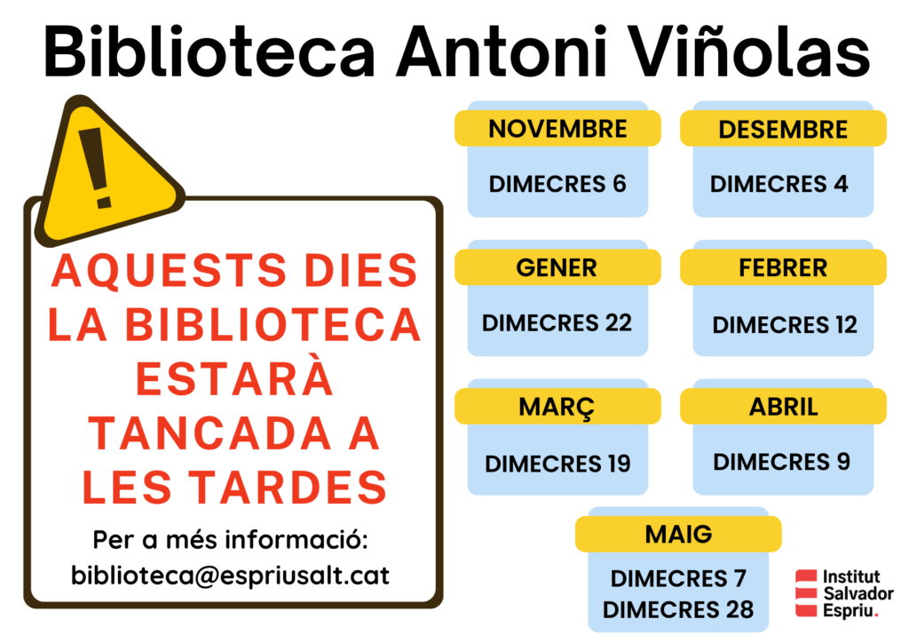 Per aquest motiu, la biblioteca de l’institut tancarà a les tardes un dimecres al mes. Les dates són les següents: