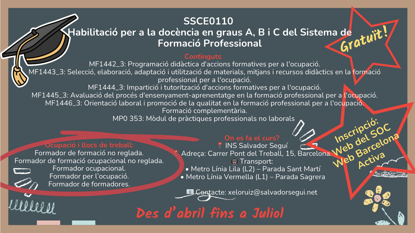 Aquest curs, l’INS Salvador Seguí impartirà el Certificat de Professionalitat SSCE0110- Habilitació per a la docència en graus A, B i C del Sistema de Formació Professional. Una formació completament subvencionada!