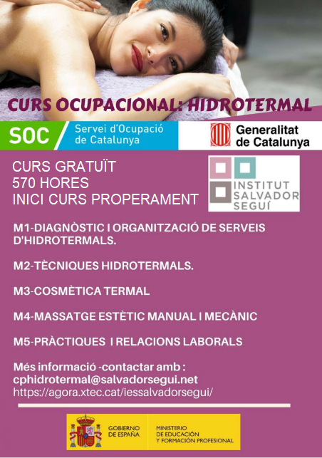 Vols obtenir un Certificat de professionalitat Hidrotermal. Aquest curs et prepara per desenvolupar activitats en centres de talassoteràpia, balnearis i centres de “spa”, independent, o bé, associats a organitzacions com a centres esportius, hotels, residències o centres de bellesa dins del departament dedicat a serveis hidrotermals. Podries treballar en el sector d’estètica-termal, sector hoteleria i turisme on s’ofereixin serveis hidrotermals, serveis de balneació, spa o wellness. El certificat es realitza durant els mesos de març a octubre col.laboració amb SOC. Inscriu-te! Per més informació et pots adreçar a cphidrotermal@salvadorsegui.