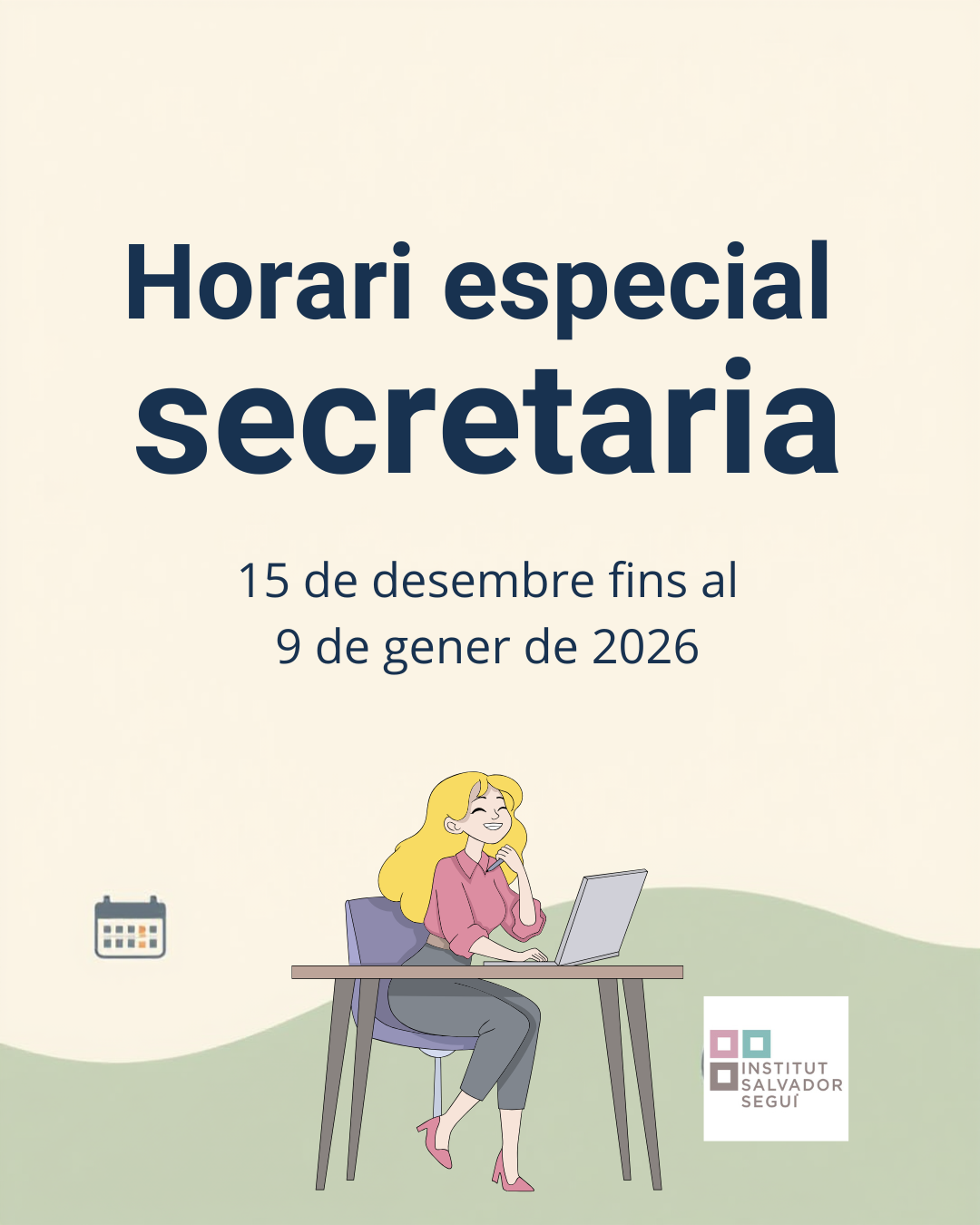 La Secretaria del centre funcionarà amb horari excepcional de matí entre el 15 de desembre i el 9 de gener de 2026. Durant aquest període, l’atenció presencial es realitzarà únicament en franja matinal, amb l’objectiu d’adequar els serveis administratius al calendari acadèmic i a l’activitat del centre durant les festes.