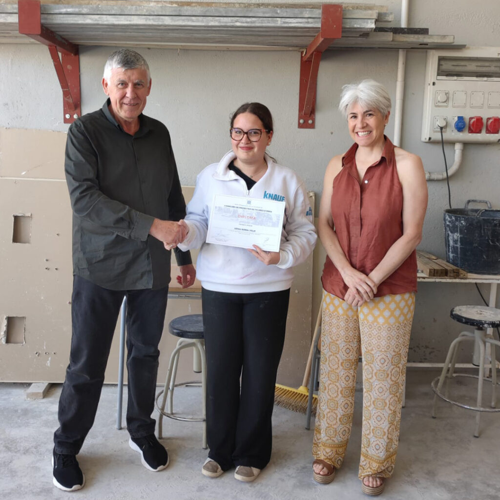 El passat 16 de maig, l’Esteve Freixas i la M. Àngels Armengol, representants de la UEC (Unió d’Empresaris de la Construcció), van visitar el nostre centre per lliurar el premi a l’alumna Xènia Serra, guanyadora del primer concurs de dibuix per dissenyar la figura del concurs de paletes novells de Campllong.