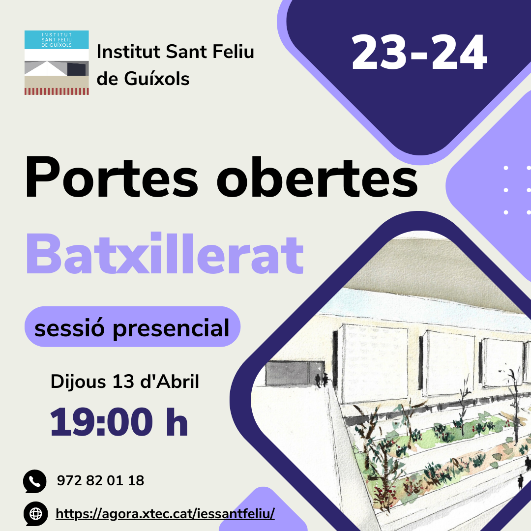 PORTES OBERTES BATXILLERAT 2023-2024. Ens plau convidar-vos a la sessió presencial de Portes obertes de Batxillerat, que es realitzarà dijous 13 d’abril a les 19:00h.… Llegeix més»