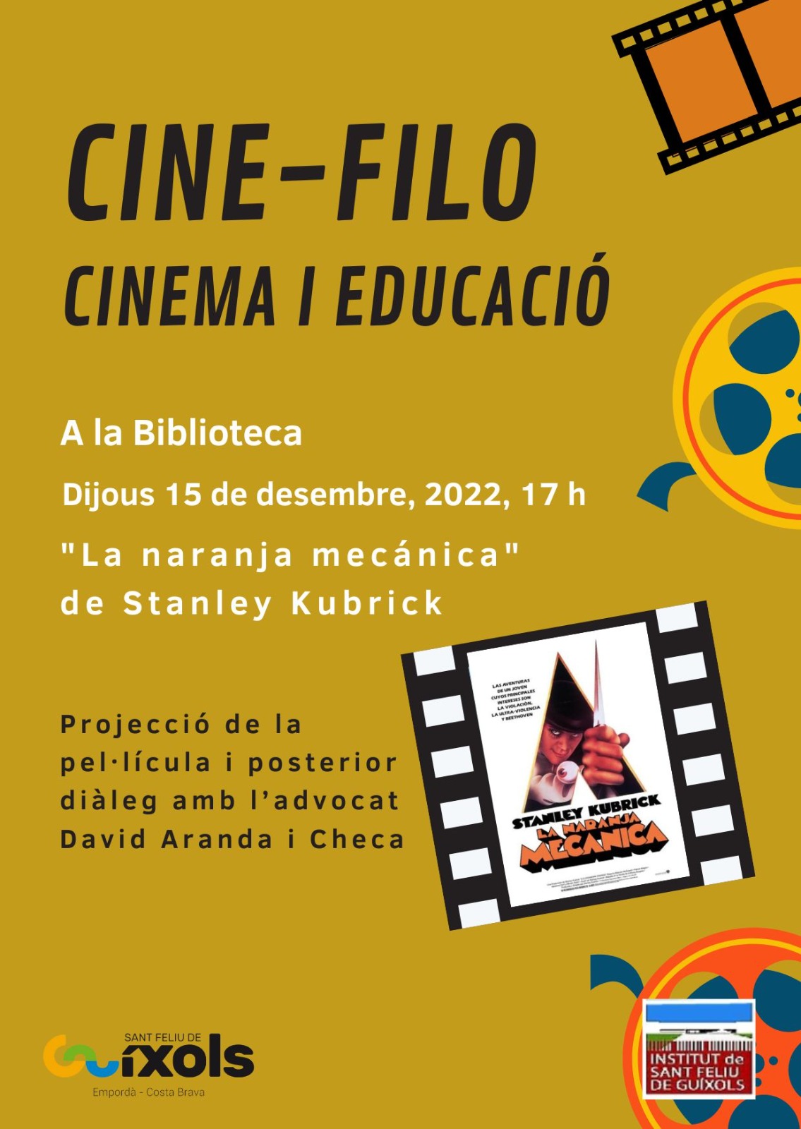El proper dijous 15 de DESEMBRE, de 17:00 a 20:00 a la biblioteca municipal projecció de la pel·lícula La naranja mecánica, de Stanley Kubrick i posterior diàleg amb David Aranda i Checa, graduat en dret i màster en criminologia, política criminal i sociologia jurídicopenal. Exerceix d’advocat en el col·lectiu Arrels, i està especialitzat en la defensa lletrada davant la jurisdicció de menors; en dret penitenciari, en dret d’estrangeria i nacionalitat i en l’àmbit de la violència masclista.