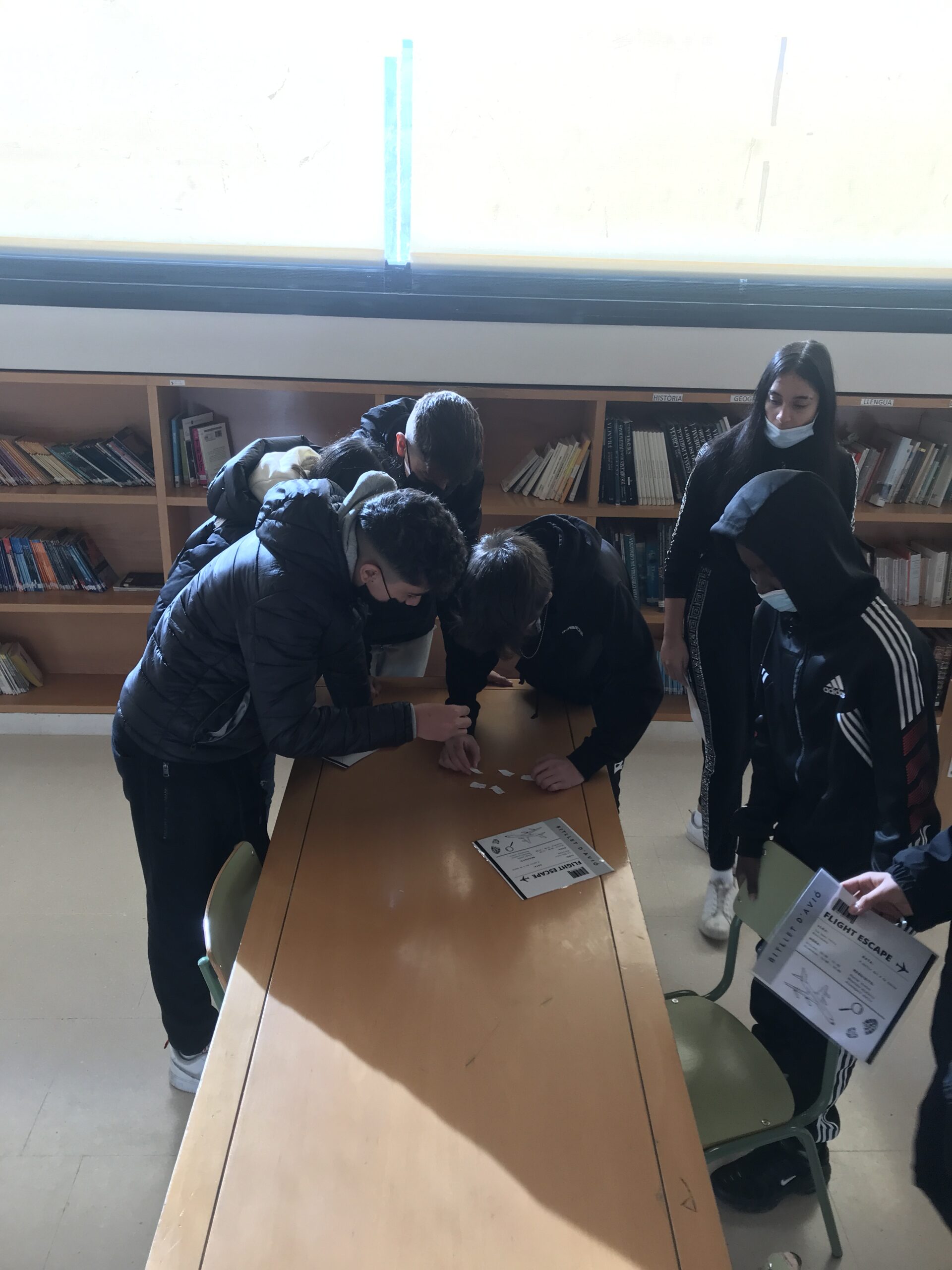 Què han fet la resta de companys d’altres optatives? En petits grups, els alumnes han de trobat pistes, resoldre proves i treballar en equip per poder escapar de l’avió que s’ha estavellat a la biblioteca de l’institut. Tot això, amb un temps límit de 15 minuts!