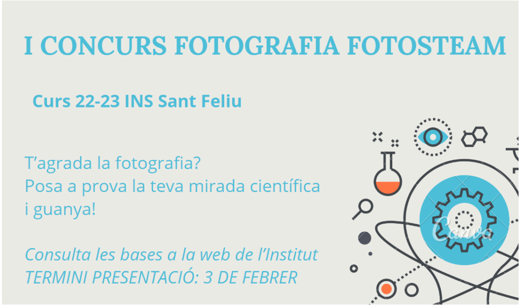 Des de la comissió STEAM us volem animar a presentar-vos al I concurs de fotografia STEAM de l’institut Sant Feliu de Guíxols, tant a l’alumnat, professorat com a la resta del personal del centre.
