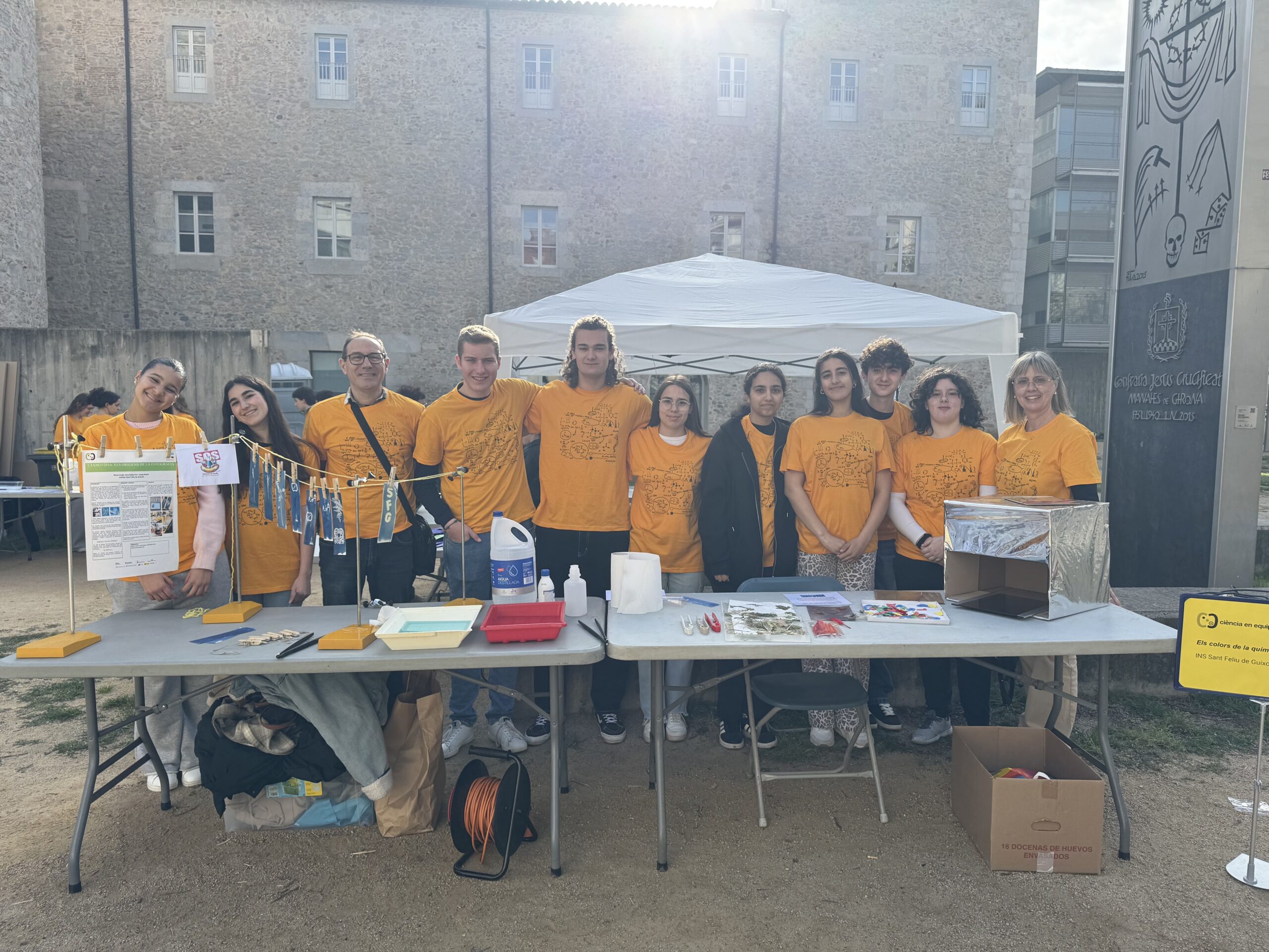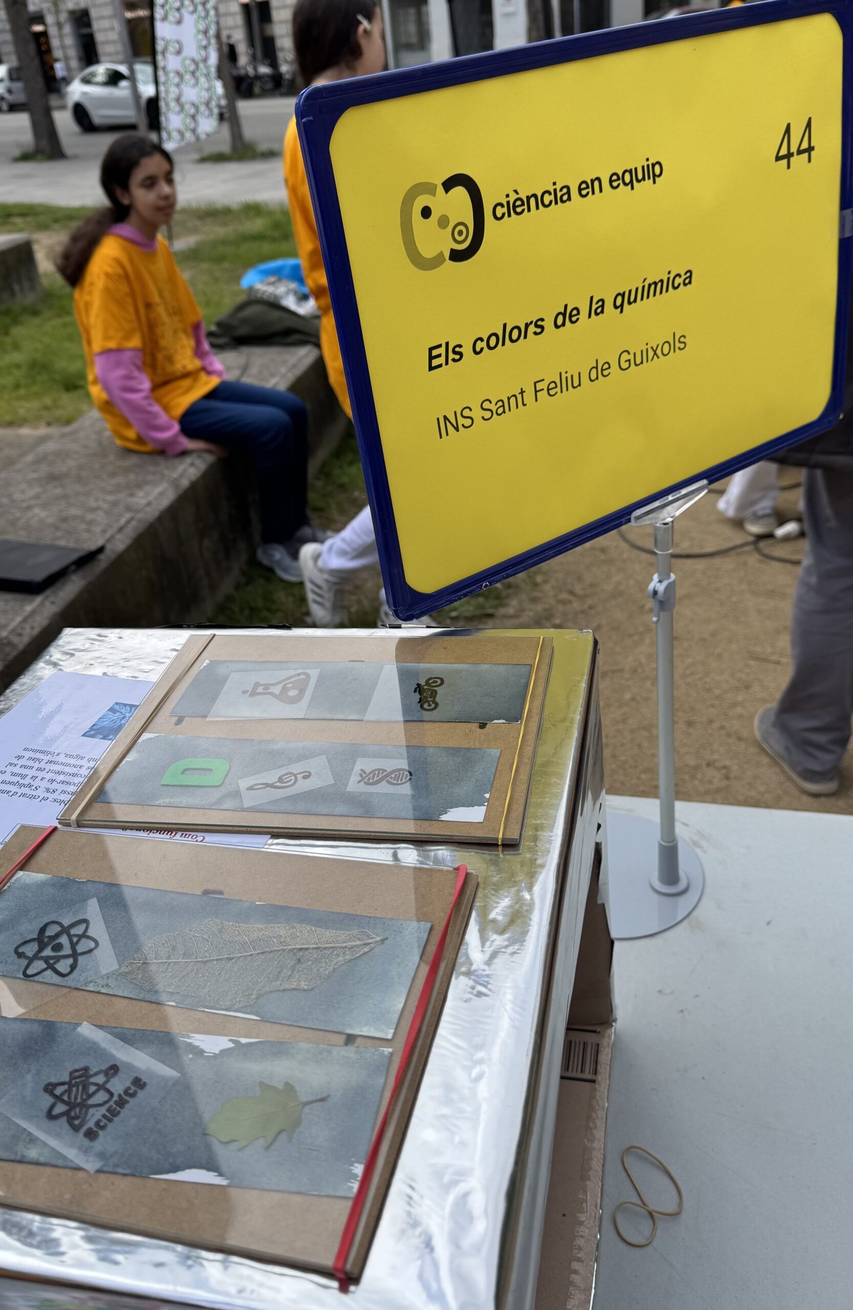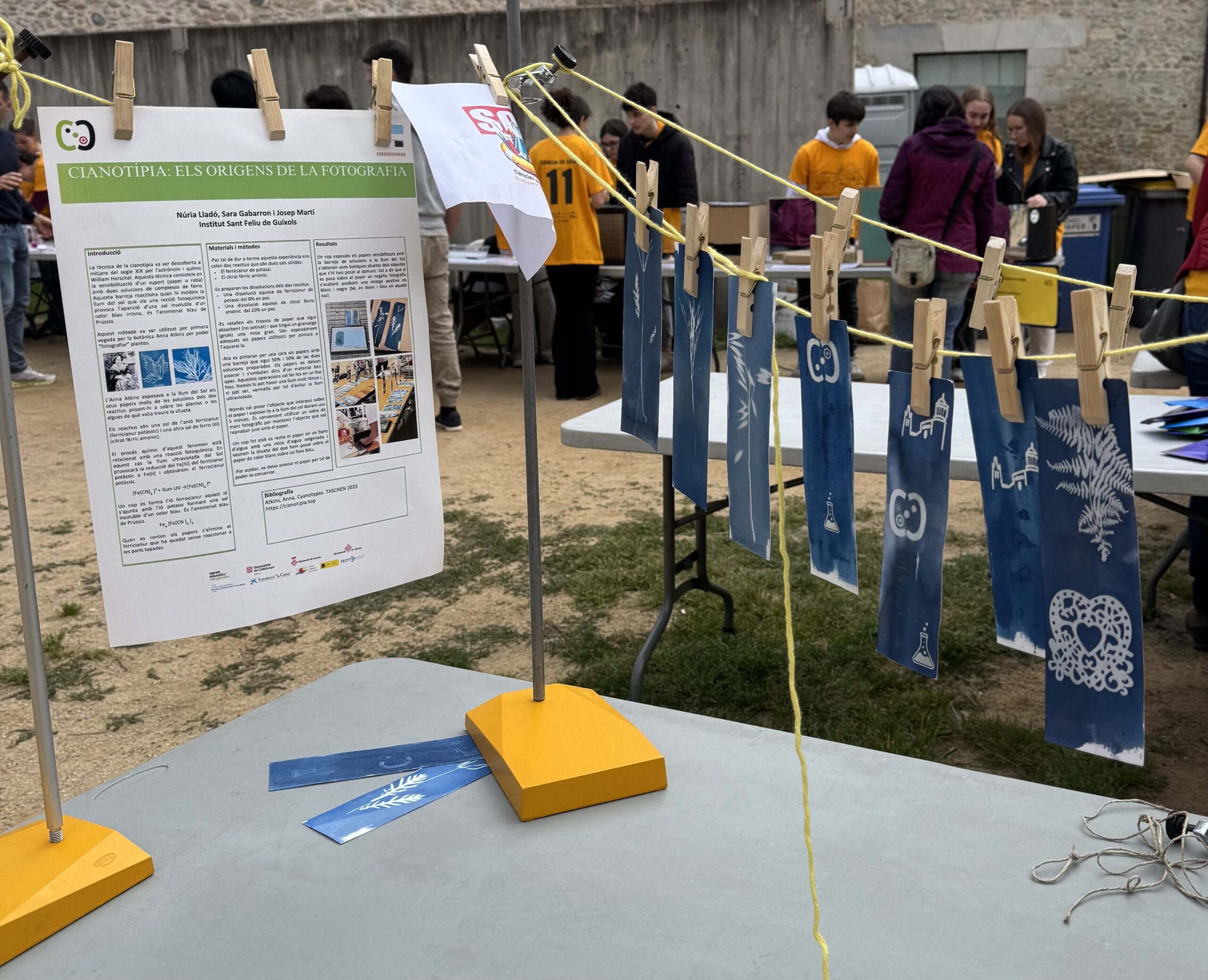 Des de l’institut de Sant Feliu es va participar en la fira amb un experiment titulat “ELS COLORS DE LA QUÍMICA.”, centrat en l’ús d’un mètode d’impressió fotogràfica analògica que aprofita la llum solar i que s’anomena cianotípia. La preparació d’aquesta activitat va permetre a l’alumnat conèixer i experimentar amb reaccions de reducció i oxidació utilitzant reactius químics preparats amb sals de ferro i la llum ultraviolada per crear punts de llibre únics. Concretament, cada visitant a l’estand de l’institut va poder elaborar i endur-se a casa un punt de llibre personalitzat amb l’ajuda i les explicacions de l’alumnat de batxillerat.