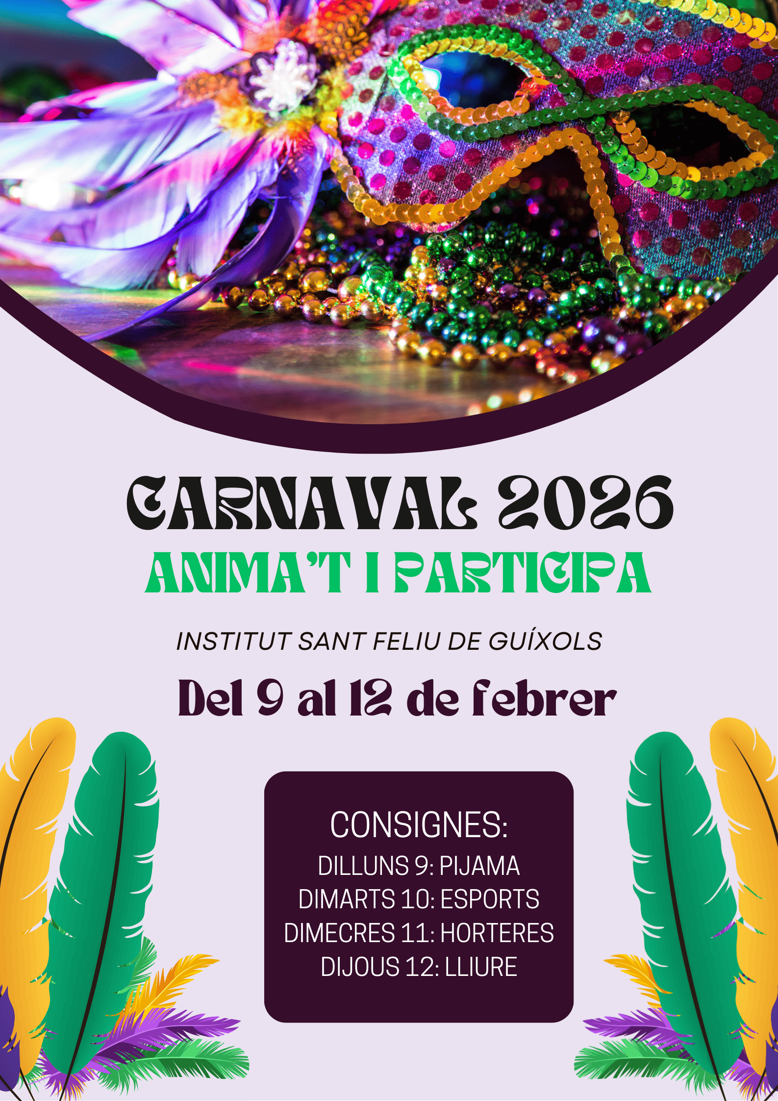 Animem tot l’alumnat a sumar-s’hi amb ganes i creativitat, ja que la participació és clau per fer d’aquesta setmana una veritable festa de Carnaval. Des de tutoria es faran arribar les consignes perquè tothom les conegui i hi pugui participar.