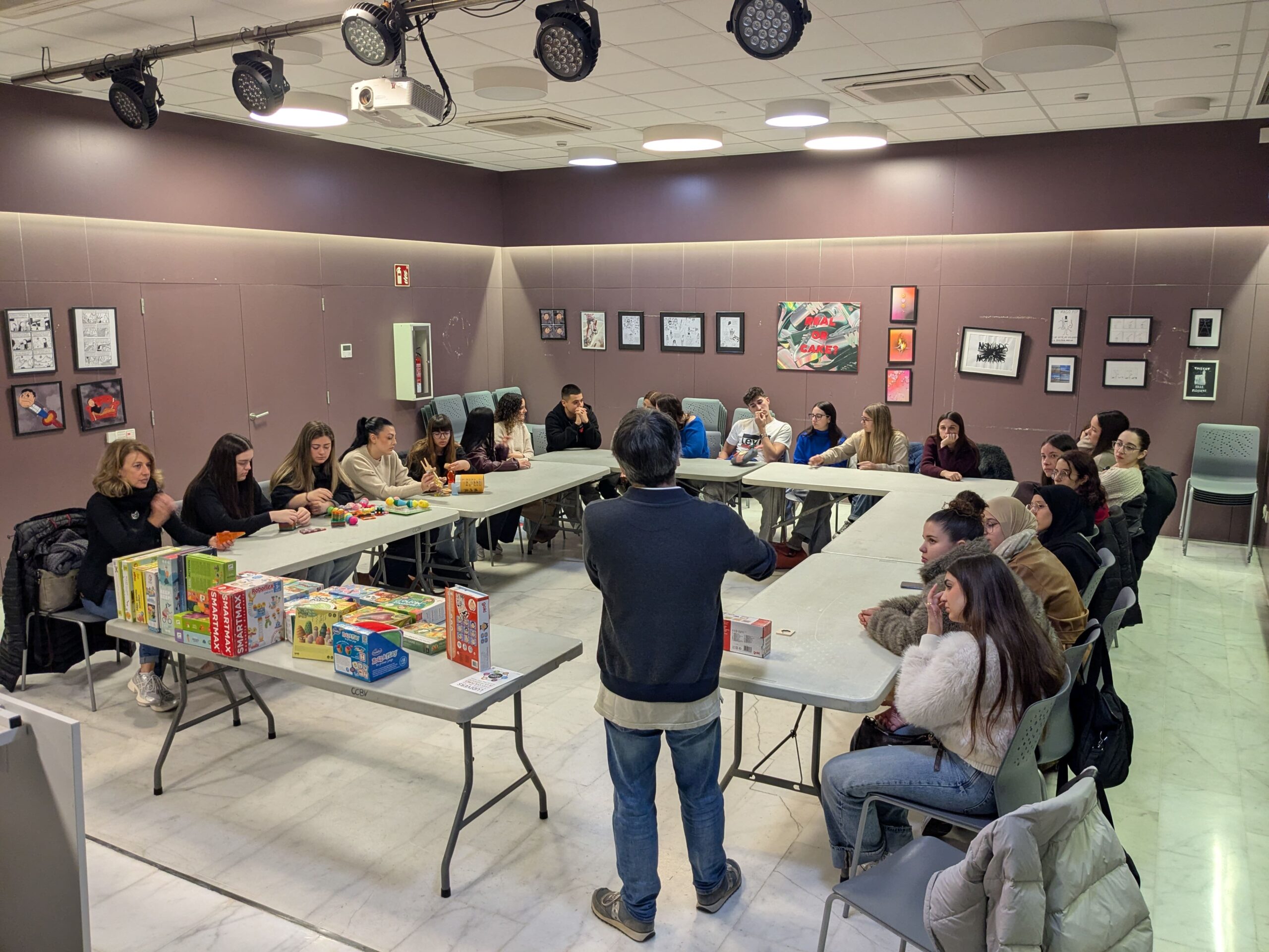 En primer lloc, l’alumnat ha participat en un taller educatiu de descoberta a càrrec de Ludus Mundi. Durant l’activitat, han pogut conèixer i experimentar amb materials de joc lliure i una àmplia varietat de jocs de taula adreçats a infants de 0 a 6 anys. Aquesta experiència ha permès reflexionar sobre el valor pedagògic del joc i ampliar el repertori de recursos didàctics per a l’etapa d’educació infantil.