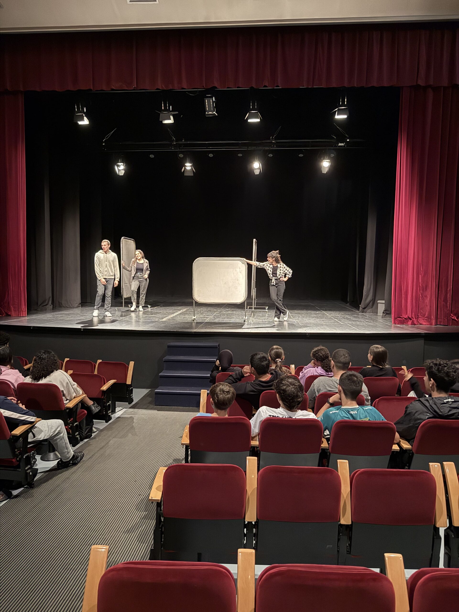Un cop acabat l’espectacle, els i les alumnes van participar activament analitzant les situacions plantejades i proposant alternatives més sanes i respectuoses per relacionar-se amb la parella, que van representar ells mateixos damunt de l’escenari, formant així part de l’obra.