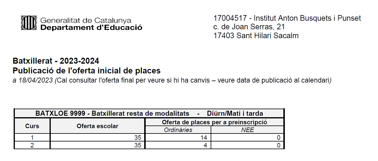 Preinscripció i matrícula Batxillerat curs 23-24