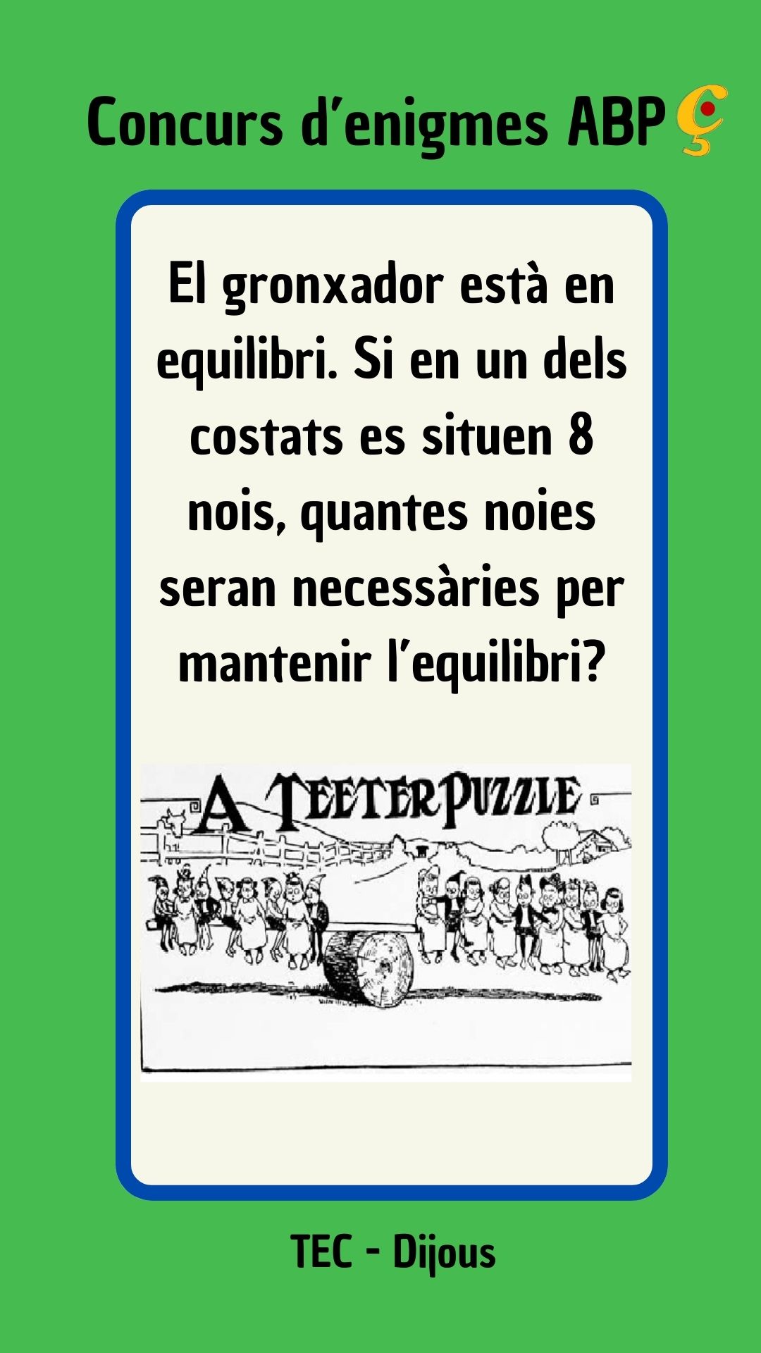 Enigmes de dijous Benvolguts/des, Benvinguts al concurs d’enigmes de la Setmana de la Ciència! Pots enviar les teves respostes a través del següent FORMULARI Avui et proposem…