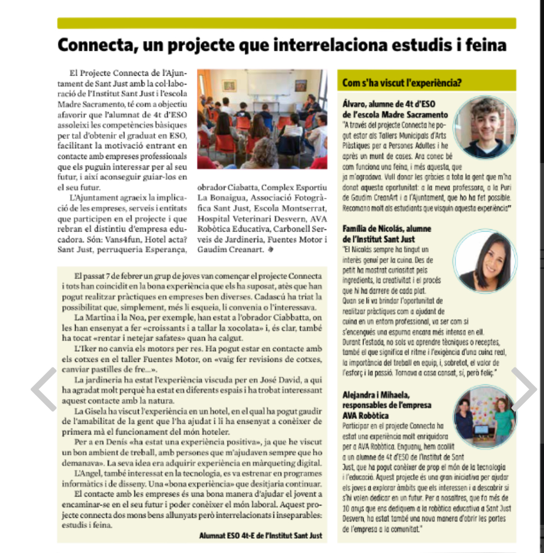 L’Ajuntament de Sant Just Desvern organitza el projecte CONNECTA. Aquest projecte té com a objectiu fer que l’alumnat de Sant Just tingui un primer contacte amb el món laboral en empreses de Sant Just que col·laboren amb el projecte de manera altruista. Enguany, hi han participat 15 dels nostres alumnes de quart d’ESO. En la publicació del mes de juny d’El Butlletí de l’Ajuntament, podeu llegir l’article que recull l’experiència dels alumnes relacionada amb aquest projecte. També apareix el testimoni de la família d’un d’aquests alumnes. Aquí sota podreu descarregar els escrits originals complets. Esperem que us agradi tant com a nosaltres.