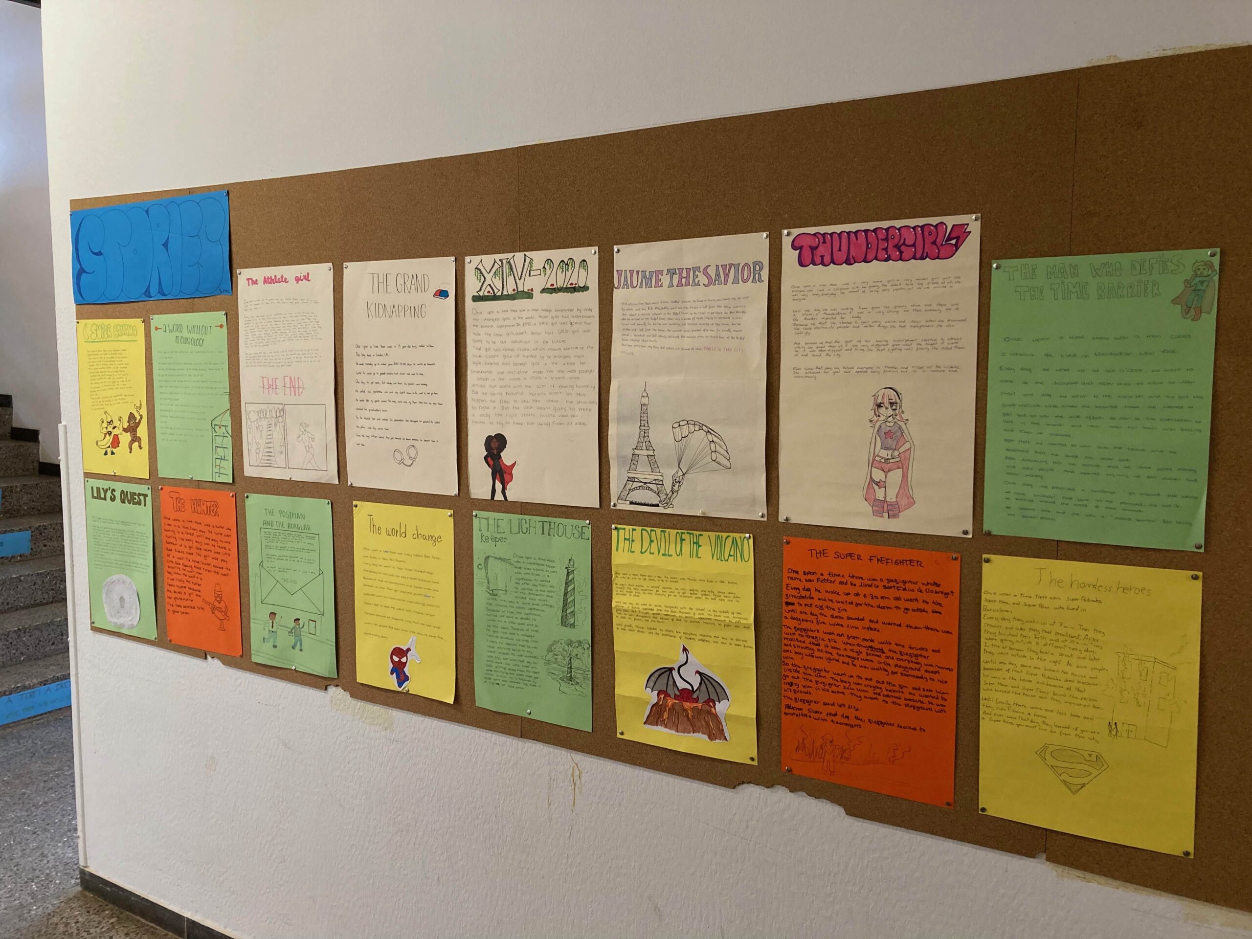 En petits grups han seguit un guió senzill per inventar-se una història, han buscat el vocabulari necessari, s’han intercanviat els escrits per corregir-los entre ells, i finalment, els han escrit i il·lustrat per ser exposats i compartits amb tot l’Institut.