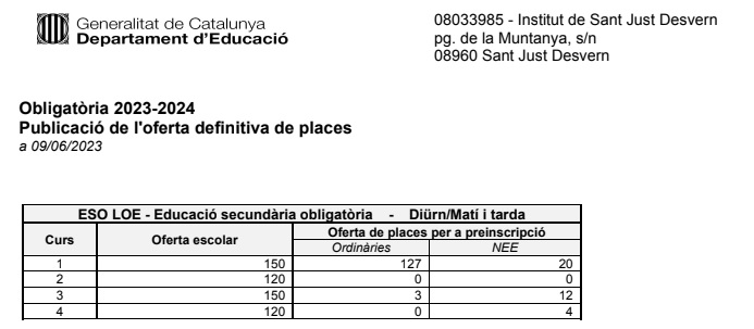 Oferta definitiva places ESOPer Institut / 09/06/2023 / Portada Secretaria / Preinscripció, Secretaria acadèmica Ja s’ha fet pública l’oferta definitiva de places d’ESO. Podeu consultar el document PDF clicant a la imatge.