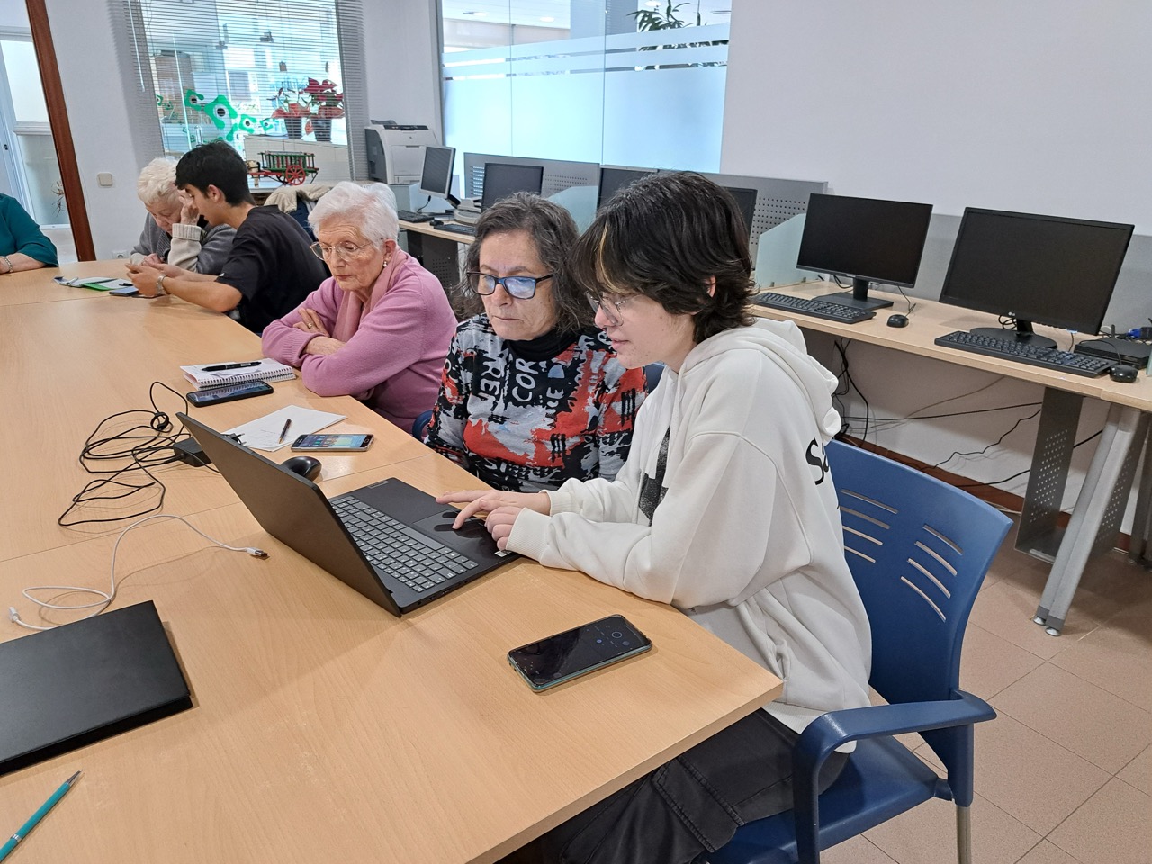 Té com a objectiu intercanviar coneixements i experiències amb la gent gran. No cal que només siguin coneixements tècnics sobre aparells i mòbils, sinó també conversar sobre maneres de veure la vida, explicacions contrastades entre els costums d’abans i els d’ara. També donen suport a les necessitats de l’entitat.