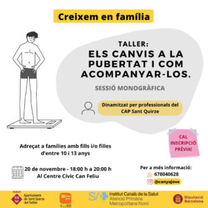 En aquesta ocasió s’ofereix un taller per famílies amb  preadolescents (de 10 a 13 anys). Es tractarà el tema dels canvis que pateixen els nostres fills i filles en aquesta etapa per entendre molt millor les seves necessitats i inquietuds.