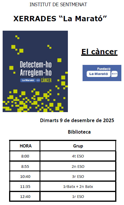 10/12/25El nostre ex-alumne Sergi Calvo, estudiant de medicina, ens va fer una xerrada molt amena i instructiva sobre el càncer: quins tipus hi ha, quins mecanismes de creixement té, quins tractaments s’apliquen avui en dia, i sobretot, la importància de la recerca. I és precisament… Llegeix més»