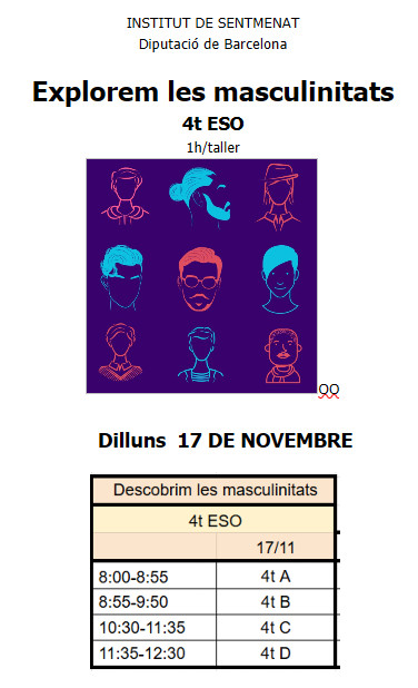 17/11/25Dilluns 17 de novembre es fa el taller Explorem les masculinitats a 4t d’ESO. És una activitat gratuïta de la Diputació de Barcelona que té per objectiu treballar la temàtica de les masculinitats des d’una perspectiva positiva i constructiva. El taller té una duració… Llegeix més»