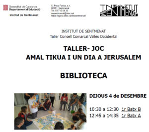 Dijous 4 de desembre es durà a terme el taller “Amal Tikua: Un dia a Jerusalem” adreçat a l’alumnat de 1r de Batxillerat. Es tracta d’una activitat gratuïta, oferida pel Consell Comarcal del Vallès, amb una durada de dues hores per grup.