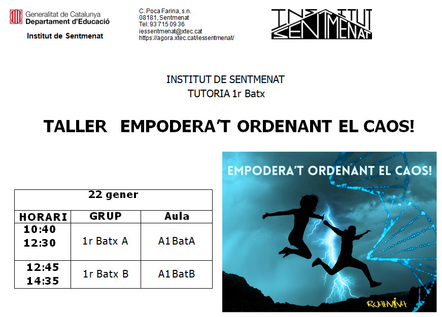 El dijous 22 de gener, l’alumnat de 1r de Batxillerat participarà en el taller-xerrada “Empodera’t ordenant el caos!”. És un taller gestionat per l’empresa Ruahviva i té una duració aproximada de dues hores cada taller.