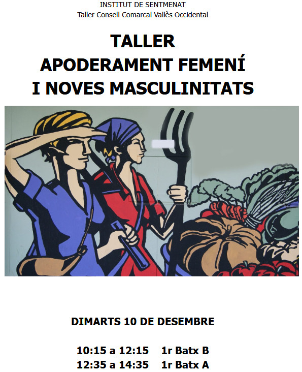 Aquest dimarts 10 de desembre es fa el taller diferenciat: Apoderament femení i Noves masculinitats a l’alumnat de 1r de Batx. És un taller gratuït del Consell Comarcal del Vallès Occidental. Té una durada de dues hores i es treballa de manera diferenciada amb els nois i amb les noies del mateix grup, amb els següents objectius: