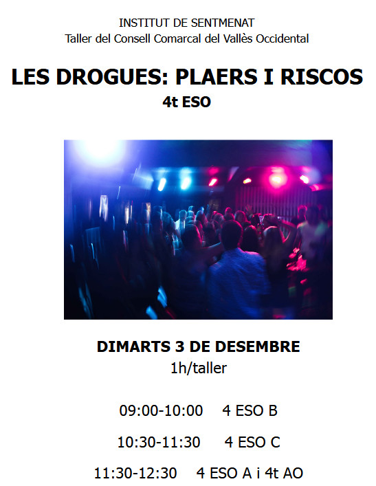Demà 3 de desembre es fa el taller Drogues: Plaers i Riscos a 4t AO i 4t d’ESO.  És un taller gratuït del Consell Comarcal del Vallès Occidental, amb una durada d’1 hora cada un.