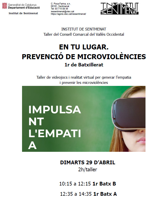 Dimarts 29 d’abril es fa el taller En tu lugar. Prevenció de microviolències a 1r de Batxillerat. És un taller gratuït del Consell Comarcal del Vallès Occidental, amb una durada de 2 hores cada un.