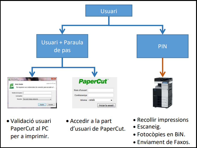 A l’hora d’imprimir haureu d’introduir el vostre usuari i el pin. Si no el teniu, demaneu-lo a Administració.