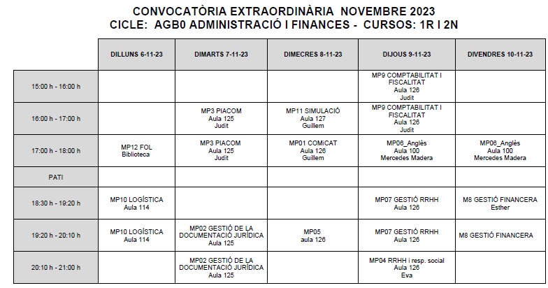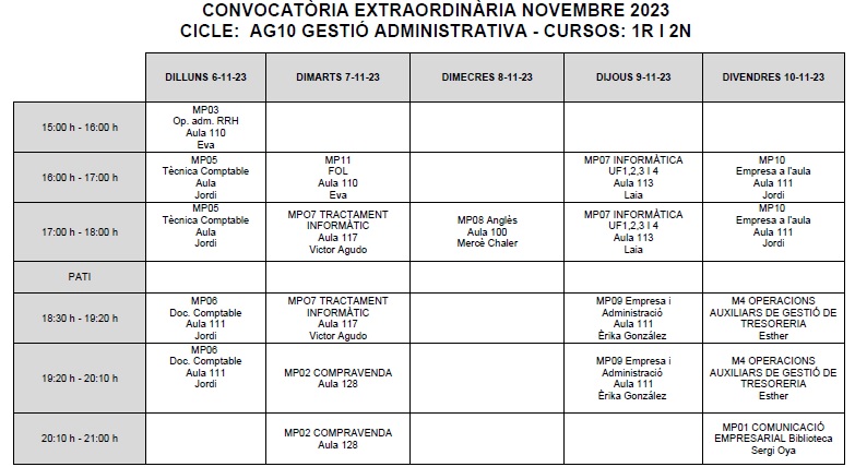 Convocatòria extraordinària de novembre del Departament d’Administració i Gestió admin20/10/23 En clicar en el títol d’aquesta publicació, es mostren els dies i hores de recuperació dels diferents mòduls (grau mitjà i grau superior) de la família professional d’Administració i Gestió Ànim!