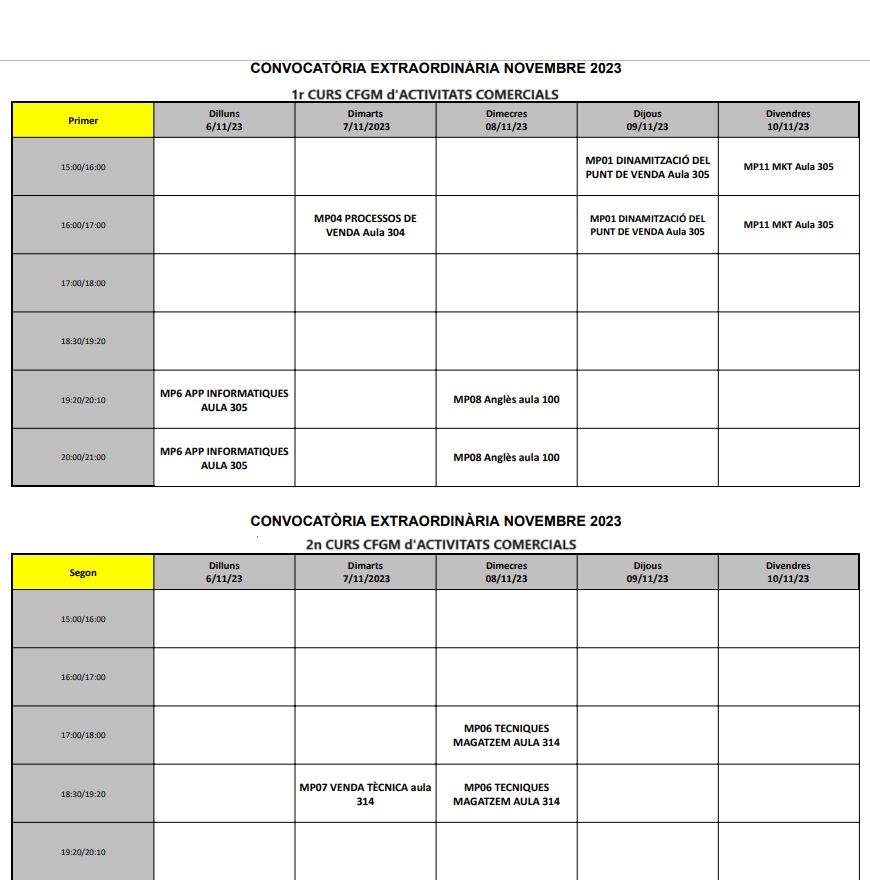 Convocatòria extraordinària de novembre del Departament de Comerç i Màrqueting. admin16/10/23 En clicar en el títol d’aquesta publicació, es mostren els dies i hores de recuperació dels diferents mòduls (grau mitjà i grau superior) de la família professional de Comerç i Màrqueting. Ànim!