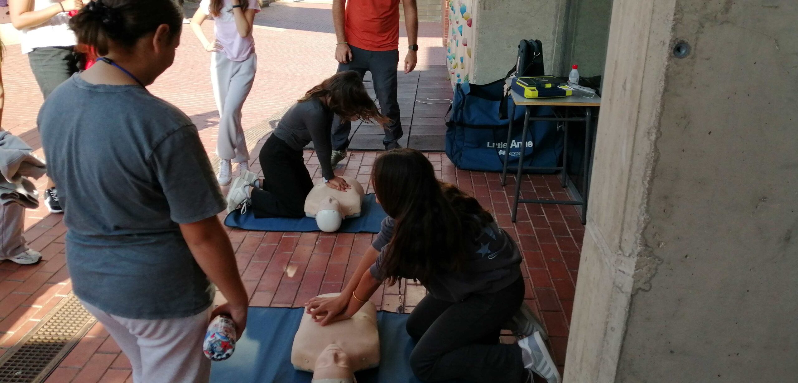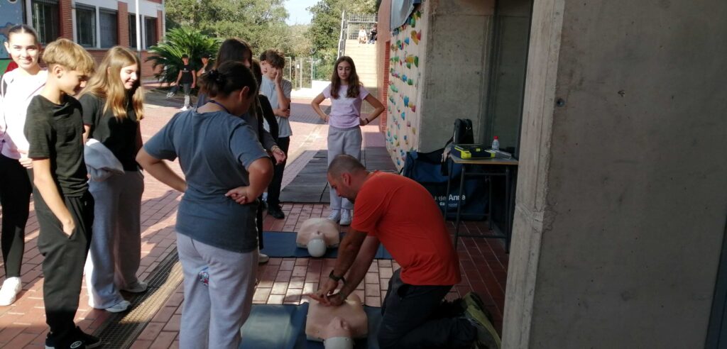 Aprofitant l’hora del pati, s’han organitzat demostracions i pràctiques per apropar a l’alumnat i professorat les tècniques de Reanimació Cardiopulmonar (RCP) i l’ús del Desfibril·lador Extern Automàtic (DEA).