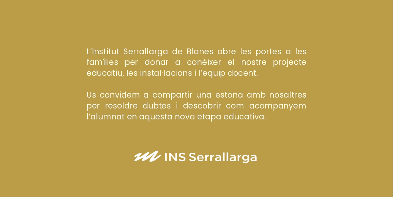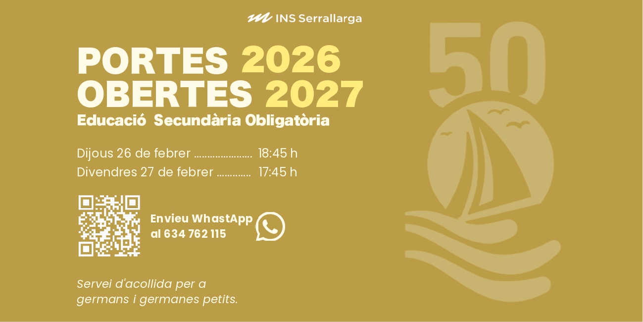 Els dies 26 i 27 de febrer se celebraran unes jornades de portes obertes de cara a famílies que vulguin inscriure els seus fills al nostre institut el curs 26/27 per cursar l’ESO. Per poder-hi assistir, cal cita prèvia, mitjançant WhatsApp, al 634762115 indicant nom, cognom i centre de referència.