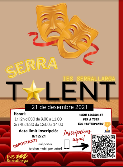 Us anunciem que els alumnes de 2n Màrqueting i Comerç estan organitzant la gala de Nadal del centre que es durà a terme el dia 21 de desembre, on s’ha creat un concurs per a l’alumnat d’ESO de l’Institut Serrallarga. Aquest esdeveniment, batejat amb el nom de Serra Talent, tindrà lloc al teatre de Blanes, on els alumnes seleccionats, podran ensenyar les seves habilitats en diverses modalitats (màgia, cant, ball, etc.).