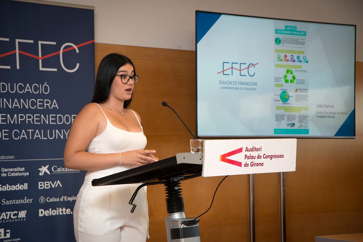 Durant l’acte de cloenda de la 12a edició del programa EFEC, que va tenir lloc al Palau de Congressos de Girona, la Júlia va poder presentar la seva infografia, i explicar què és l’economia circular i els punts més importants en què es fomenta. En aquest acte van assistir membres de l’organització del programa, el director d’educació financera de l’Insitut d’Estudis Financers, el director general de Política Financera d’Assegurances i Tresor, representants de les entitats col·laboradores, voluntaris del programa i representants dels centres educatius que hi han participat.