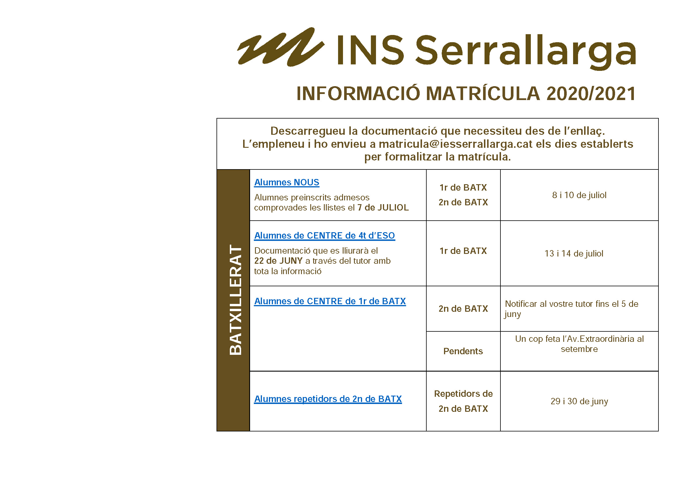Informació MATRÍCULA Batxillerat
