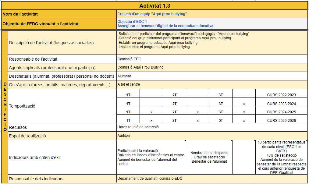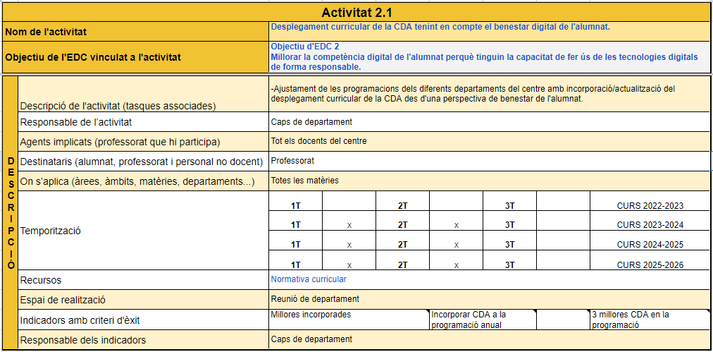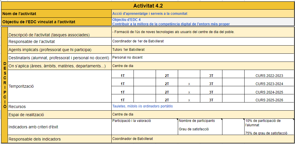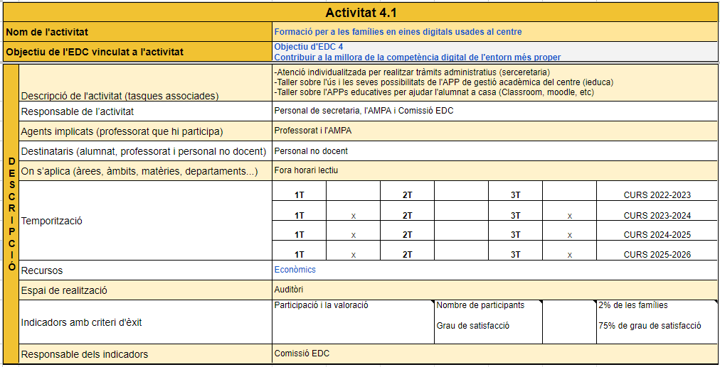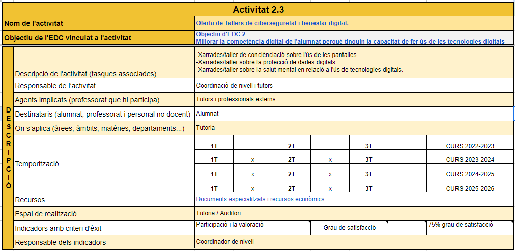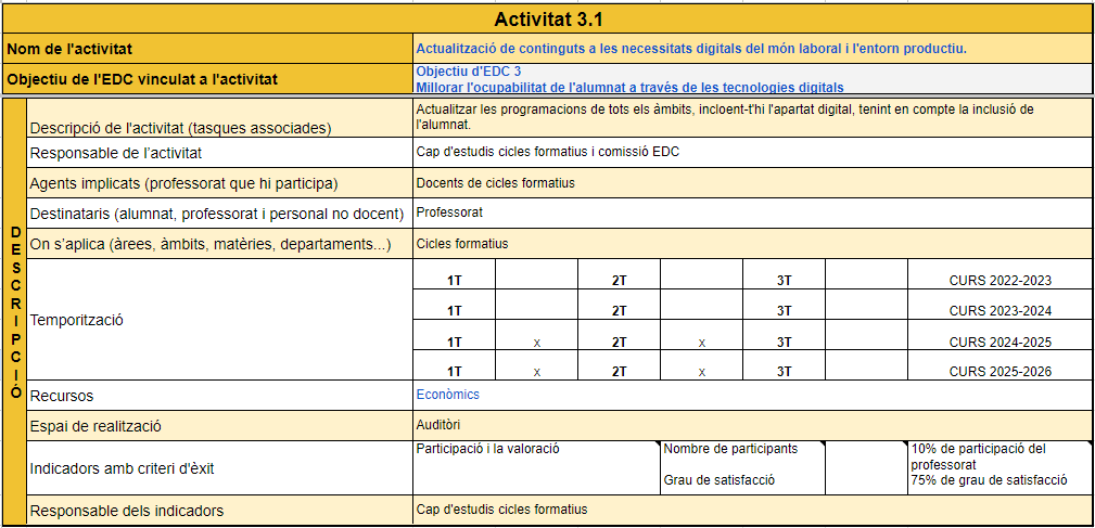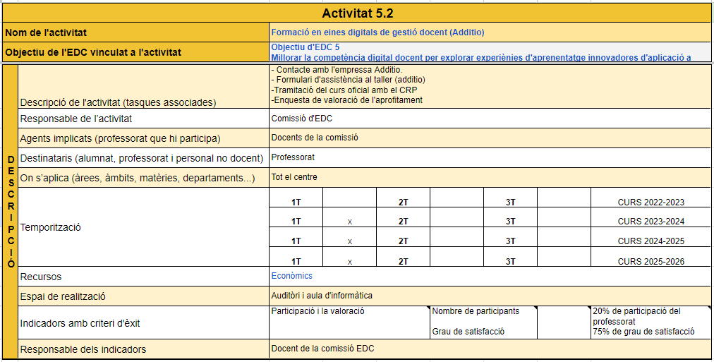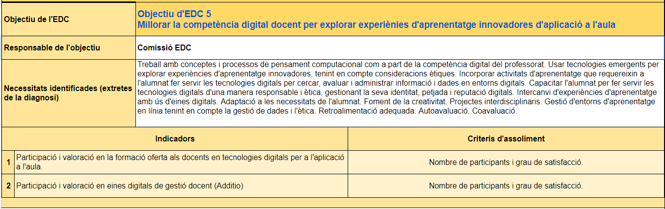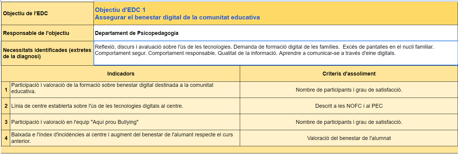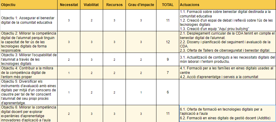 Arran del buidatge i anàlisi de la diagnosi es redacten sis objectius tenint en compte la visió i missió del projecte educatiu de centre. Després de presentar-ho al claustre, es prioritzen conjuntament amb la direcció del centre i es proposen algunes activitats a dur a terme. A continuació s’adjunta la captura de pantalla de la taula on es va realitzar la priorització dels objectius.