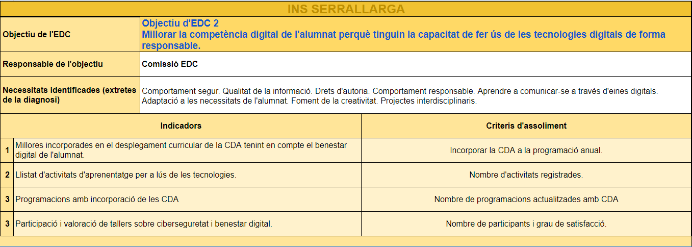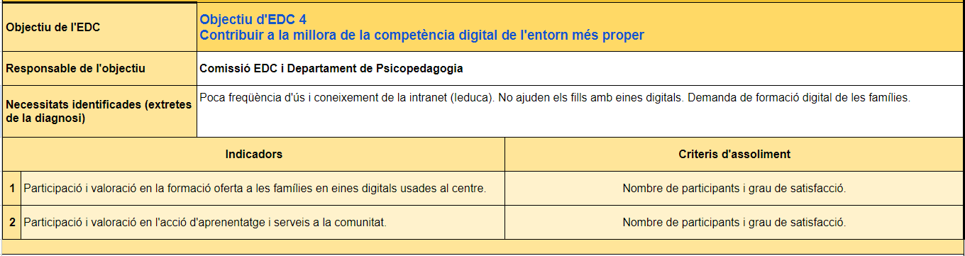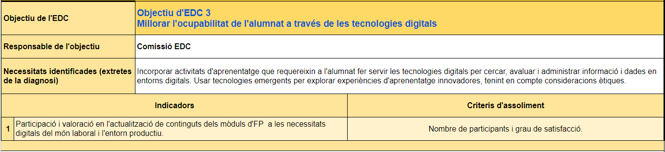 A continuació es presenten els objectius a assolir una vegada identificades les necessitats, amb els indicadors i els criteris d’acompliment: