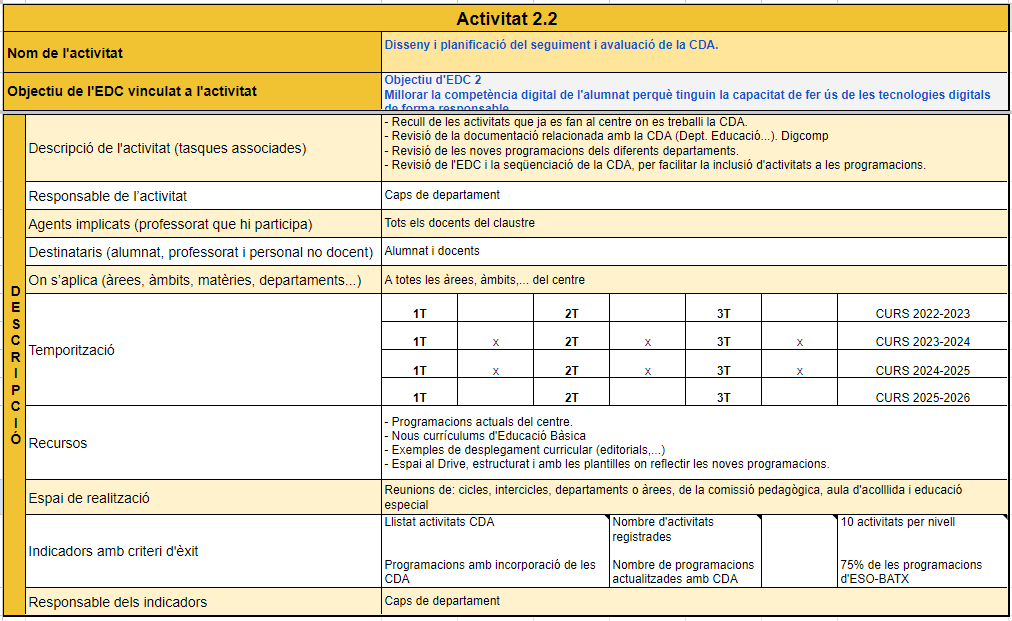 Descripció de les actuacions dissenyades per la Comissió d’Estratègia Digital per aconseguir els objectius, amb els indicadors d’execució (o abast) i de qualitat, i els seus criteris d’èxit.